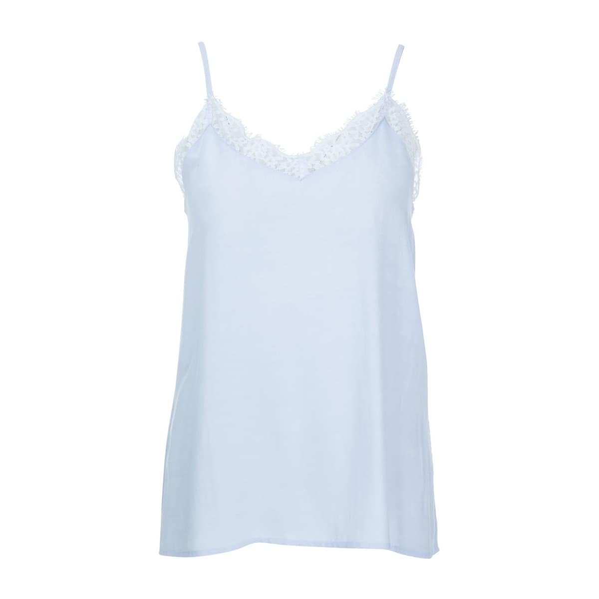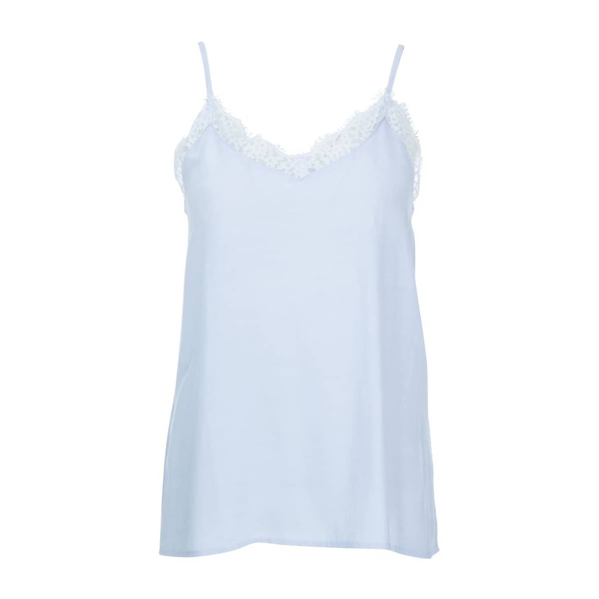 Lichtblauwe top van Frogbox. Deze top is gemaakt van viscose en heeft een uitlopende losse pasvorm. De top heeft een witte kanten strook aan de hals, is mouwloos en heeft verstelbare spaghetti bandjes.