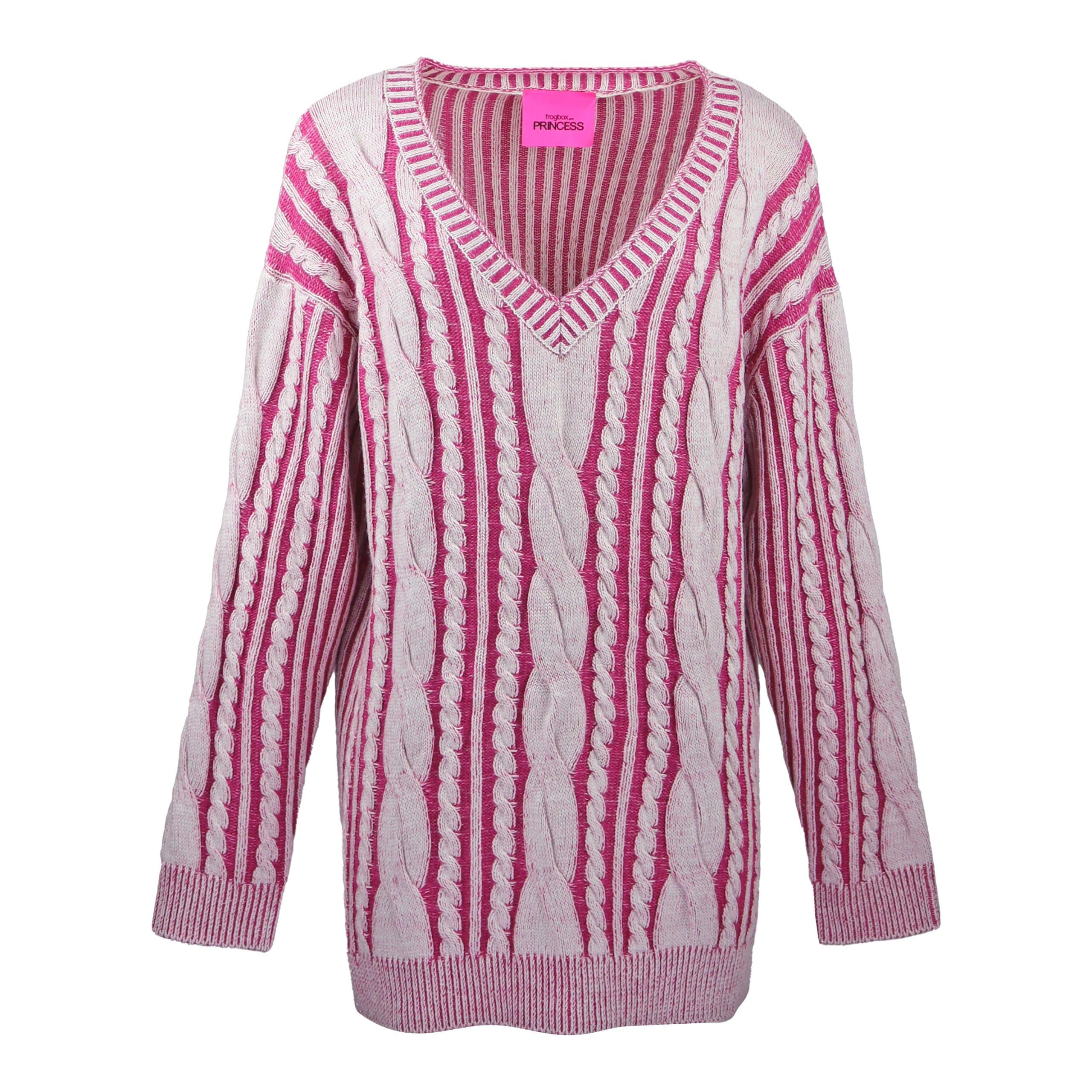 Oversized roze pull van Frogbox by Princess, model long pullover plated cables in cone flower. Deze trui is gemaakt van een wol mix en gebreid met een kabel motief. De trui heeft een relaxte losse pasvorm, V-hals, lange mouwen en valt op de heup.