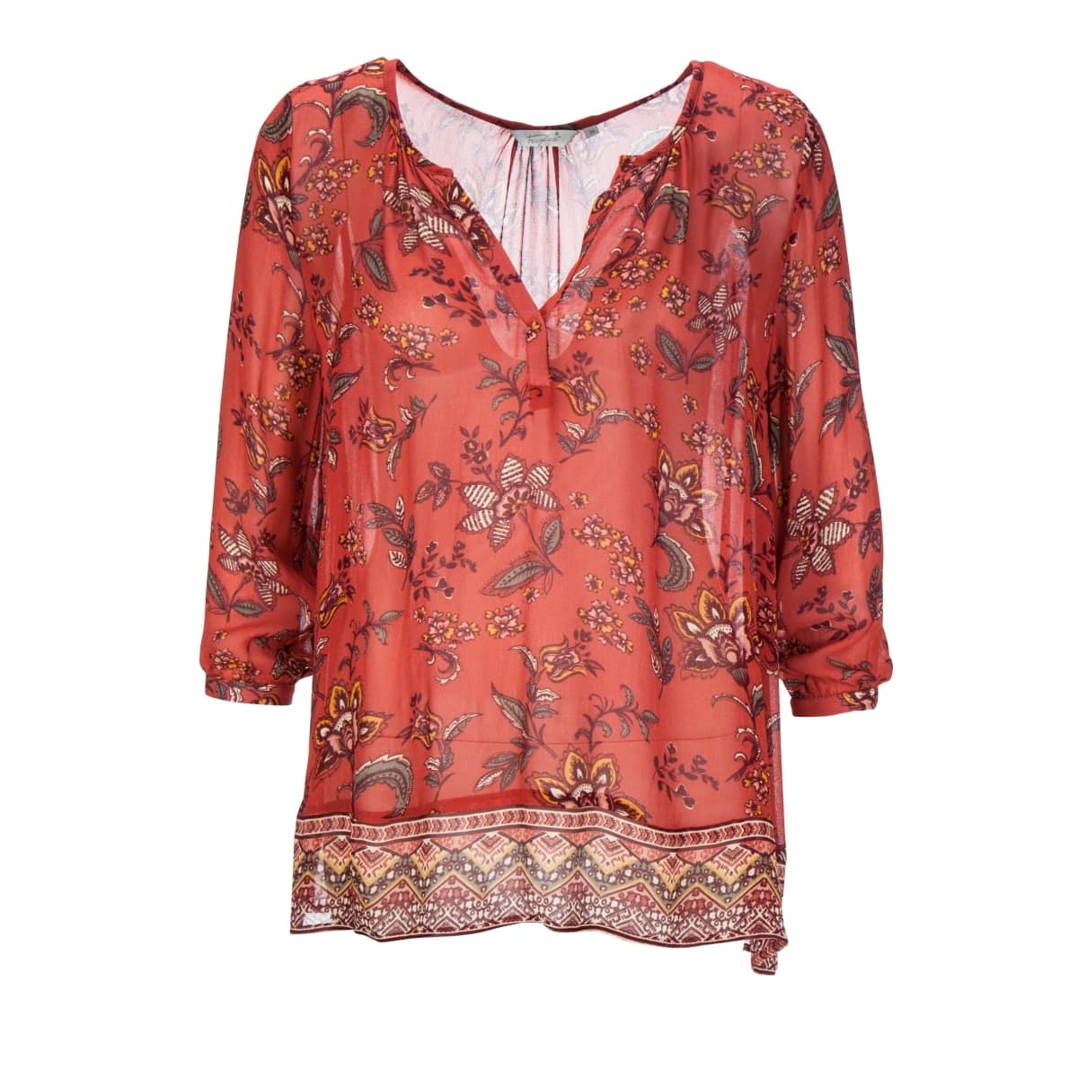 Losvallende tuniek van Frogbox. Deze tuniek is licht doorschijnend en heeft een boho bloemen print. De tuniek heeft driekwart mouwen en een V-insnede aan de voorzijde.