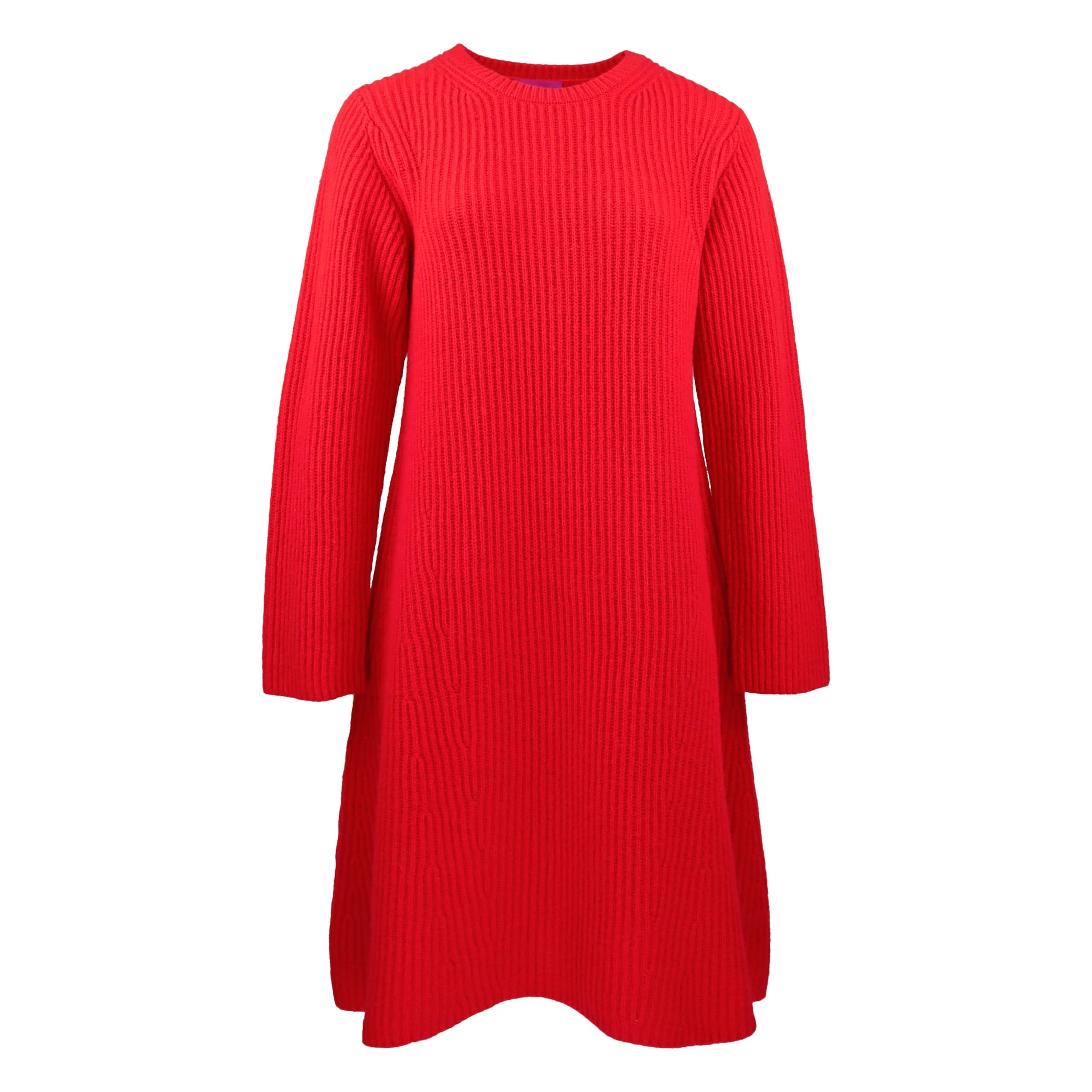 Rood kleedje van Frogbox by Princess, model basic rib dress in lava. Deze gebreide jurk is gemaakt van 100% merino wol en heeft een losvallende pasvorm met een uitlopende rok. De jurk heeft een ronde hals, lange mouwen en valt tot op de knie.