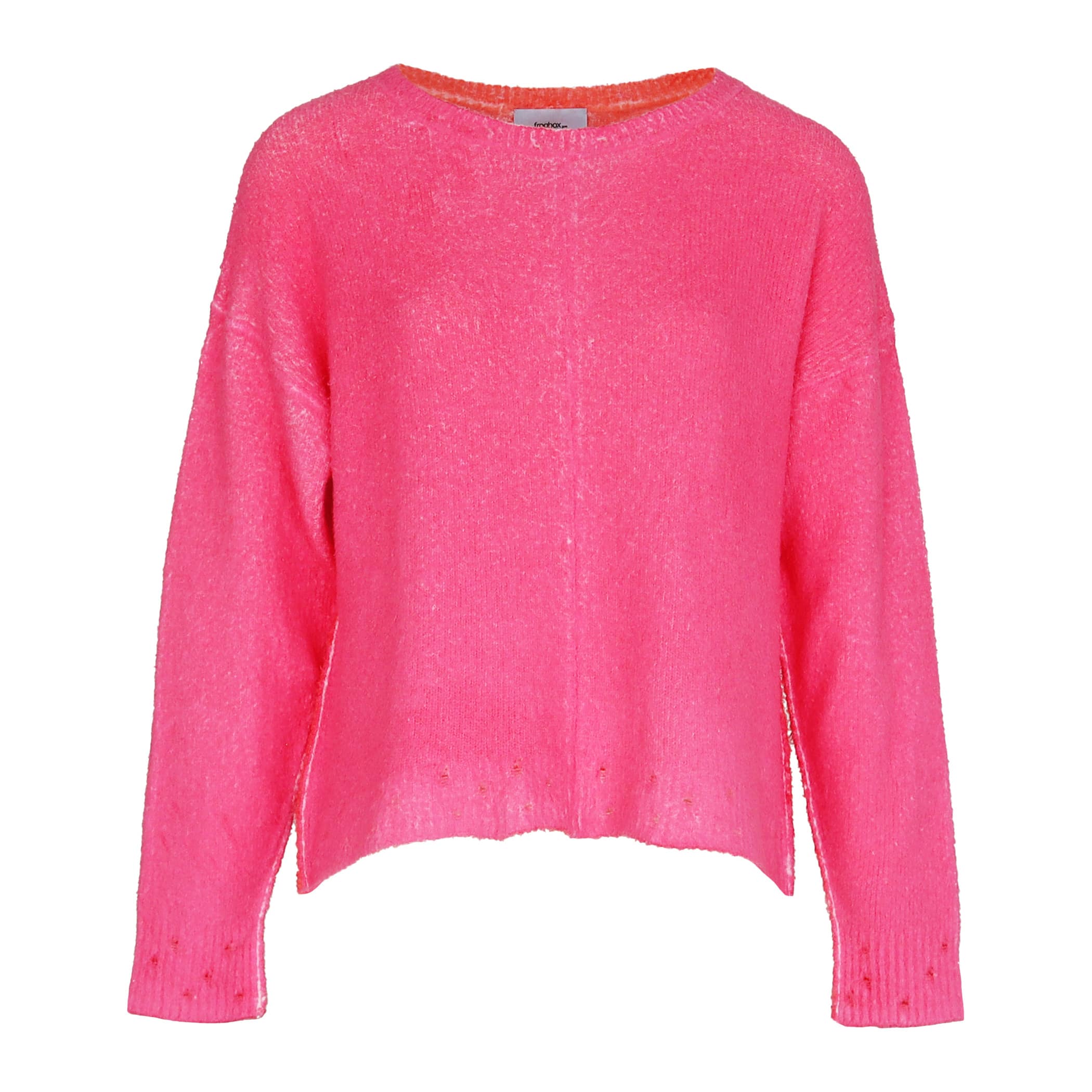 Roze pull van Frogbox goes Princess, model pullover in & outside print in raspberry sorbet. Deze trui is gemaakt van een katoen mix, heeft een used look en voelt zacht aan. De trui kan aan twee kanten gedragen worden. De ene zijde heeft een roze wassing gehad en de andere zijde een oranje. De trui heeft een relaxte pasvorm, ronde hals en lange mouwen.