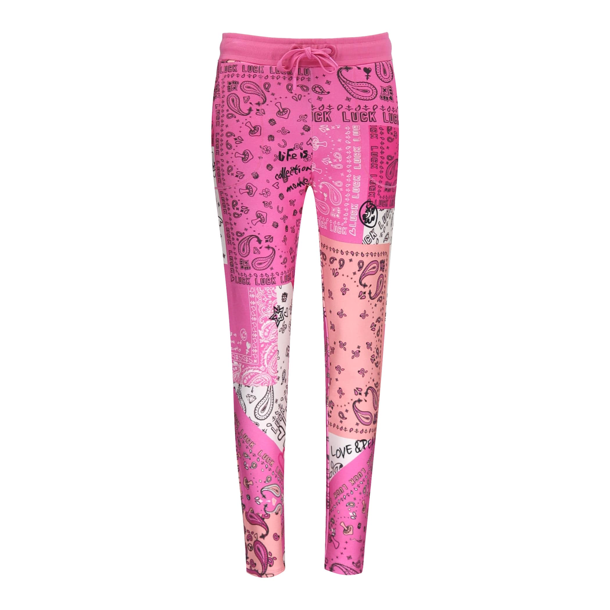 Relaxte broek van Frogbox by Princess, model sweat pants bandana in patch it. Deze sweat pants heeft een roze met witte patch print en toelopende broekspijpen. De broek heeft een elastische taille met trekkoord en twee steekzakken.