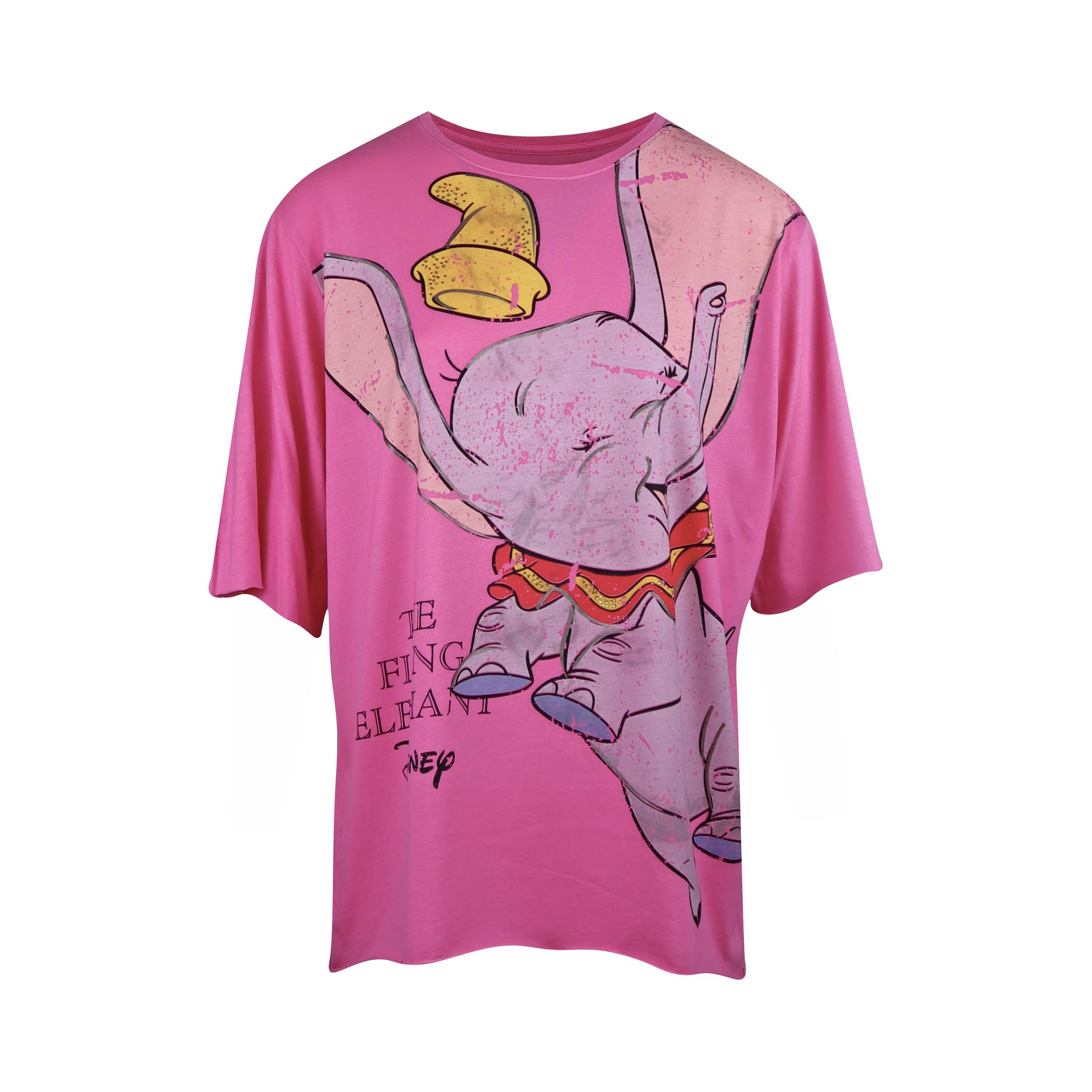 Roze t-shirt van Frogbox. Dit oversized shirt heeft op de voorzijde een afbeelding van Dombo met daarbij de woorden the flying elephant. De muts en halsband van Dombo hebben kleine steentjes die licht glimmen. Het shirt heeft een ronde hals en korte mouwen.