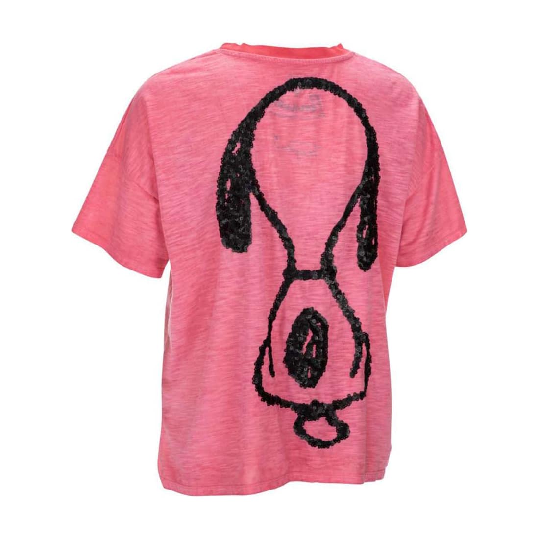 Roze oversized t-shirt van Frogbox by Princess. Dit katoenen shirt heeft op de voorzijde in zwarte letters Snoopy. Aan de achterzijde zie je de achterkant van Snoopy in zwarte pailletten. Het t-shirt heeft een los vallende pasvorm, ronde hals, korte mouwen en is aan de voorzijde korter dan aan de achterzijde.