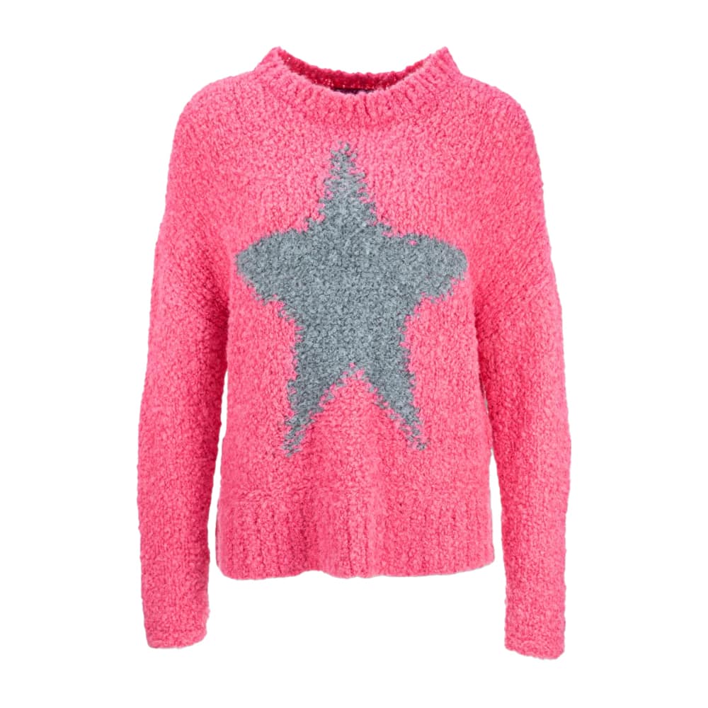 Roze wollen pull van Frogbox by Princess, model fluffy sweater with star. Deze trui is gemaakt van een wol mix met alpaca wol en heeft een grijze ster in het midden. De trui heeft een relaxte oversized pasvorm, ronde hals en lange mouwen.