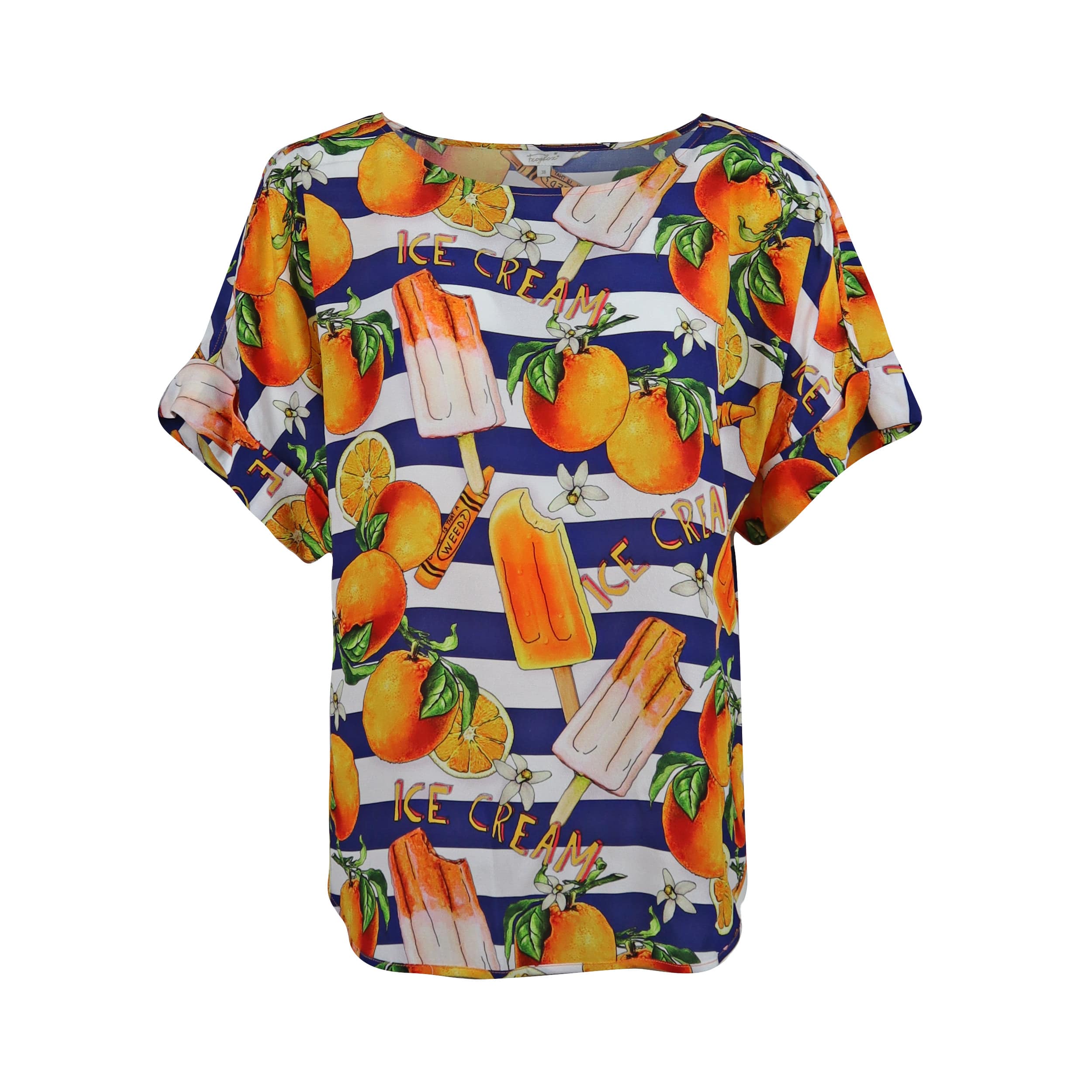 Gestreept shirt van Frogbox. Dit oversized shirt heeft op de voorzijde oranje afbeeldingen van sinaasappels en ijsjes op een wit, blauw gestreepte achtergrond. Het shirt heeft een brede, ronde hals en korte mouwen.
