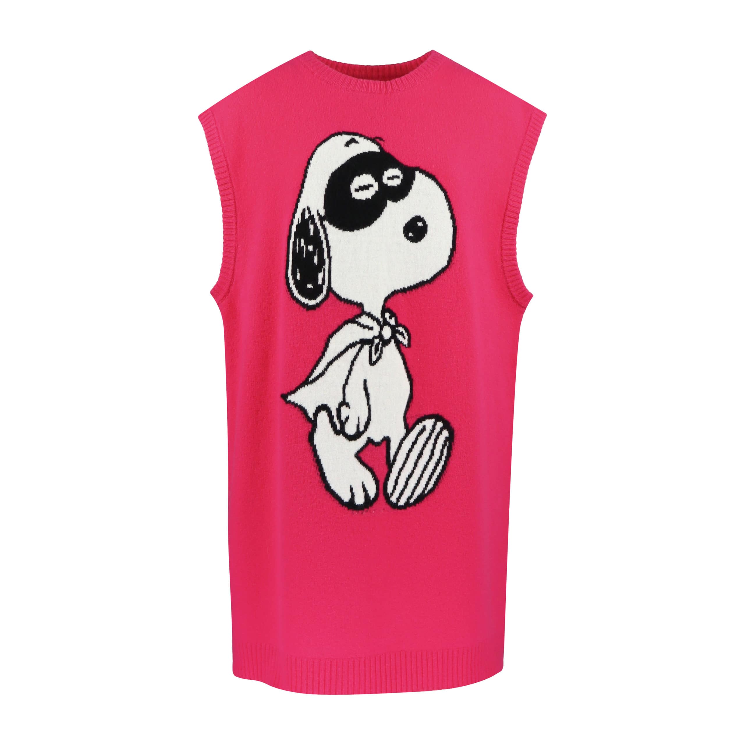Roze fijn gebreid kleedje van Frogbox by Princess. Deze relaxte oversized jurk is gemaakt van 100% merino wol en heeft een geborduurde Snoopy aan de voorzijde. De korte jurk is mouwloos en heeft een rechte losse pasvorm.