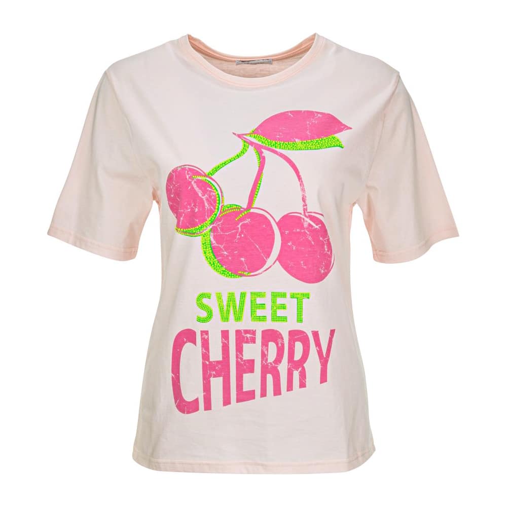 Lichtroze t-shirt van Frogbox. Dit katoenen shirt heeft op de voorzijde een afbeelding van kersen die versiert zijn met neon groene steentjes. Hieronder staat sweet cherry, waarbij het woord sweet ook versiert is met noen groene steentjes. Het t-shirt heeft een normale pasvorm, ronde hals en korte mouwen.