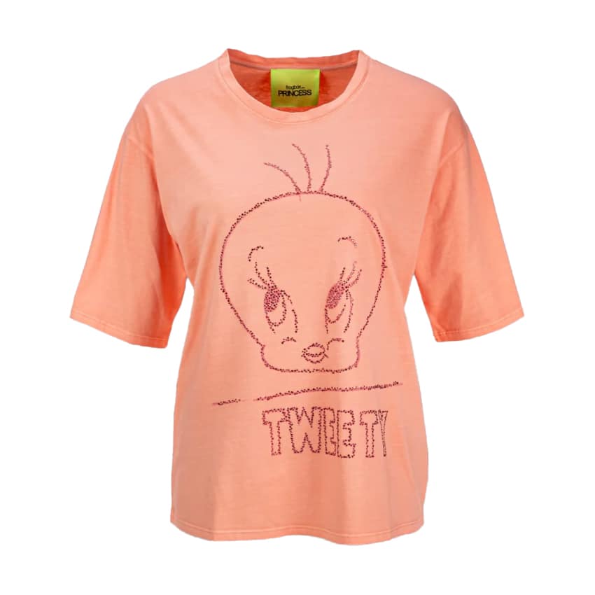 Tweety t-shirt van Frogbox by Princess, model shirt with simple Tweety print in melon. Dit t-shirt heeft op de voorzijde een afbeelding van Tweety in fijne strass steentjes. Het t-shirt heeft een losse pasvorm, ronde hals en korte mouwen.