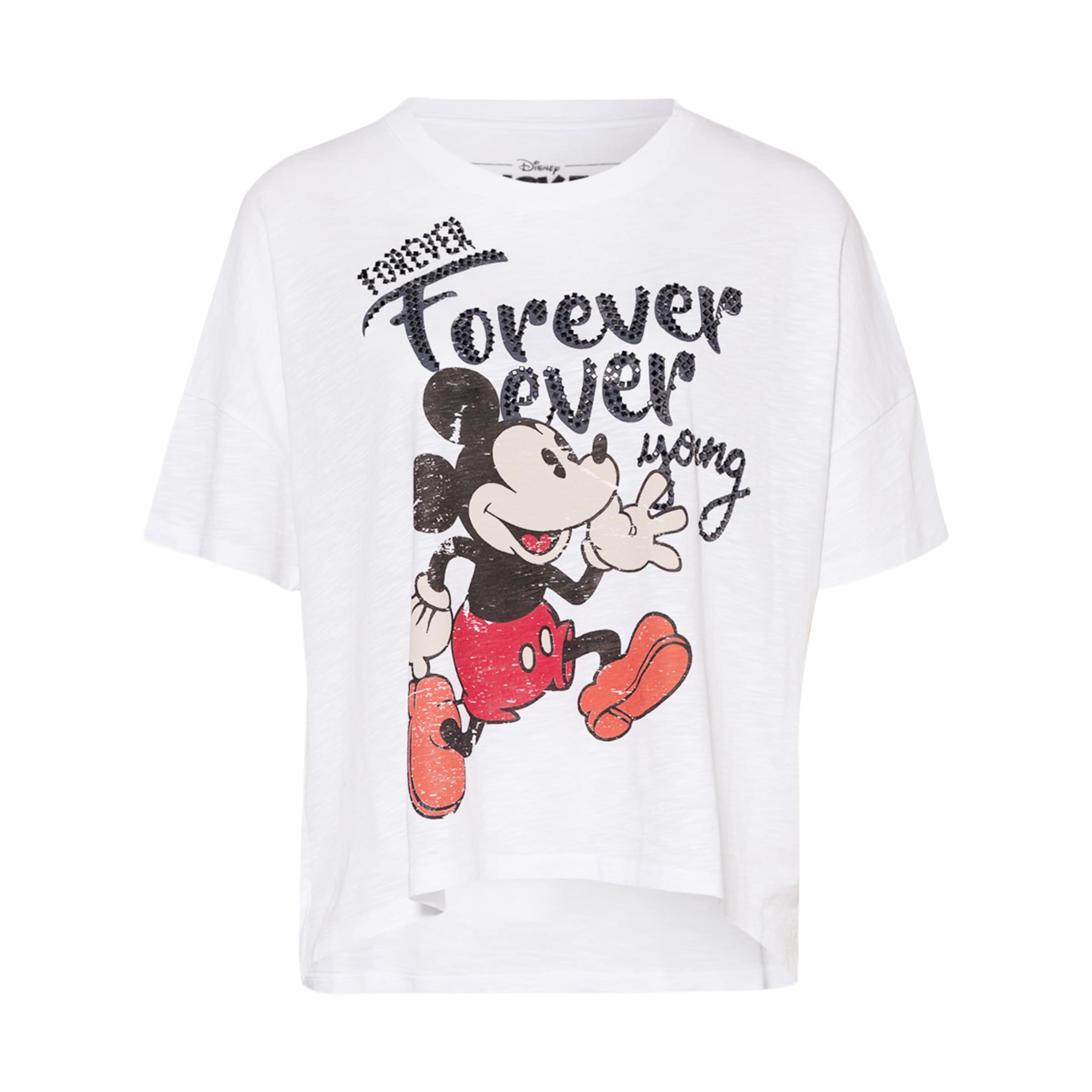 Wit oversized t-shirt van Frogbox by Princess. Dit shirt heeft op de voorzijde een afbeelding van Mickey Mouse en de woorden Forever Ever Young met zwarte steentjes. Het t-shirt heeft een langere effen witte achterzijde, los vallende pasvorm, ronde hals en korte mouwen. Het shirt is gemaakt van een mix van katoen en modal, waardoor het extra zacht aanvoelt en fijn draagt.