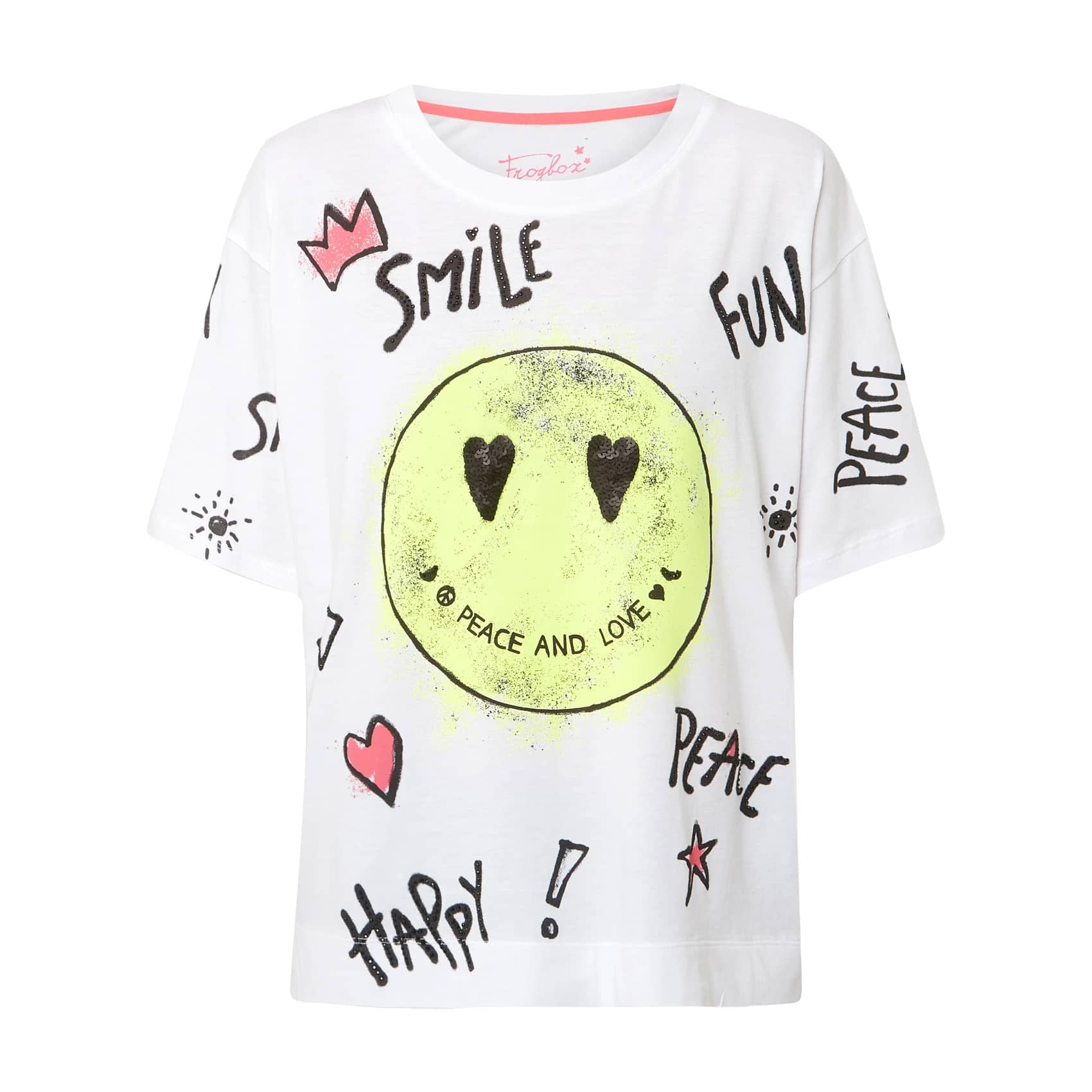Kort oversized t-shirt van Frogbox. Dit witte shirt heeft op de voorzijde een grote neon smiley met daar omheen de woorden smile, fun, happy en peace. De grote smiley heeft ogen van zwarte pailletten en diverse zwarte woorden of randen hebben zwarte steentjes. Het t-shirt heeft een los vallende pasvorm, ronde hals, korte mouwen en is extra zacht, doordat er modal in verwerkt is.