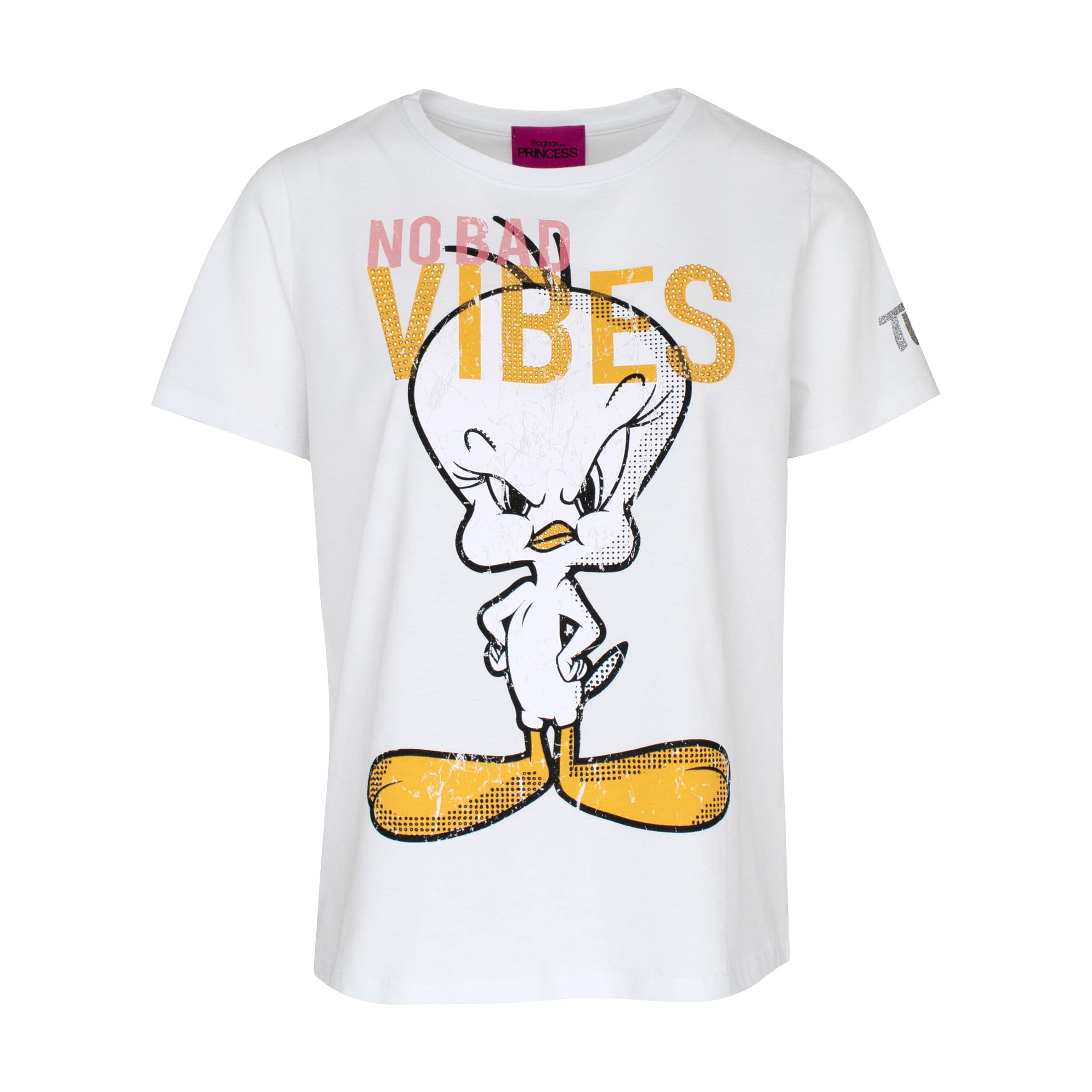 Wit t-shirt van Frogbox goes Princess, model Tweety t-shirt in clear white. Dit t-shirt heeft op de voorzijde een afbeelding van Tweety met de tekst no bad vibes die versiert is met steentjes. Het t-shirt heeft een losse pasvorm, ronde hals en korte mouwen.