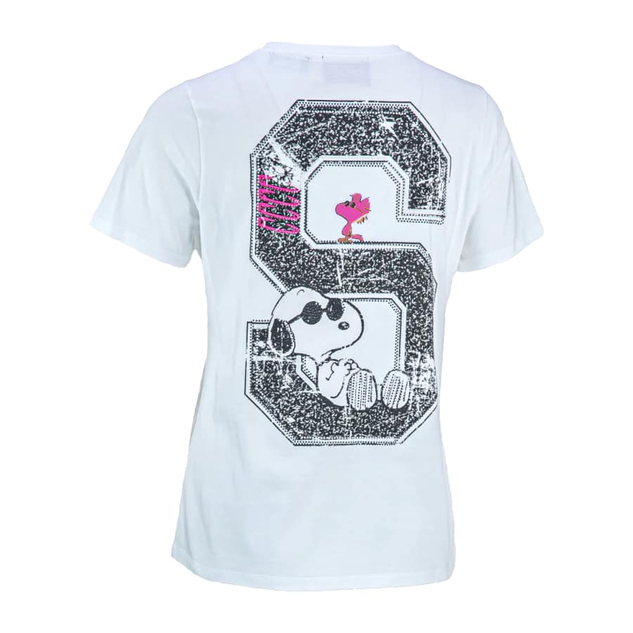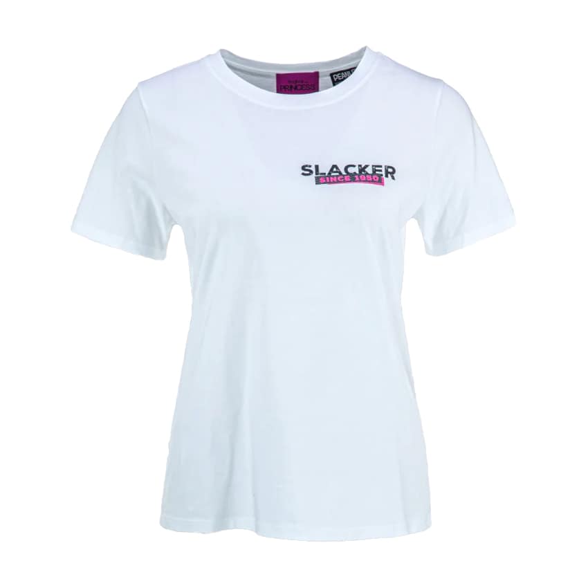 Wit t-shirt van Frogbox by Princess, model Snoopy & Woodstock slacker t-shirt in clear white. Dit t-shirt heeft op de voorzijde een kleine afbeelding met slacker since 1950. Aan de achterzijde staan Snoopy en Woodstock relaxted in de letter S. Het t-shirt heeft een losse pasvorm, ronde hals en korte mouwen.