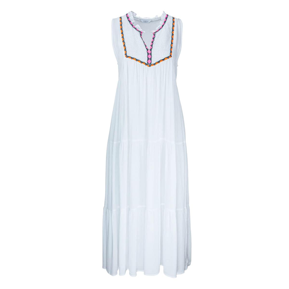 Wit midi kleedje van Frogbox. Deze jurk is mouwloos, valt tot op de kuit en heeft volants in de rok. De jurk heeft een los vallende pasvorm en een gesmockte body met neon roze en neon oranje details.