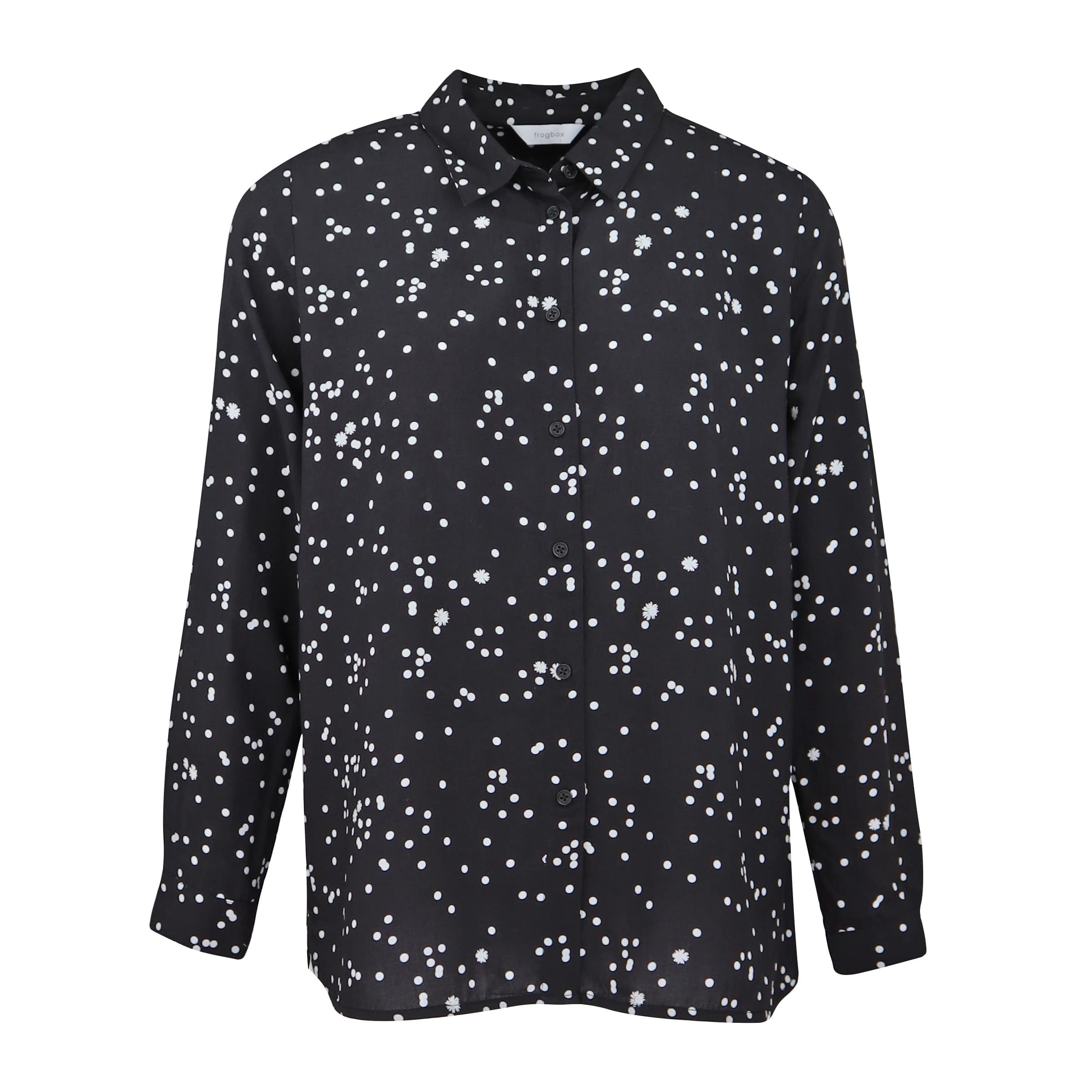 Losvallende blouse van Frogbox goes Princess, model dot flower blouse in spot light. Deze blouse is gemaakt van een zwarte stof met witte stippen en bloemen. De blouse heeft een klassieke kraag, lange mouwen en sluit met een knoopsluiting aan de voorzijde.