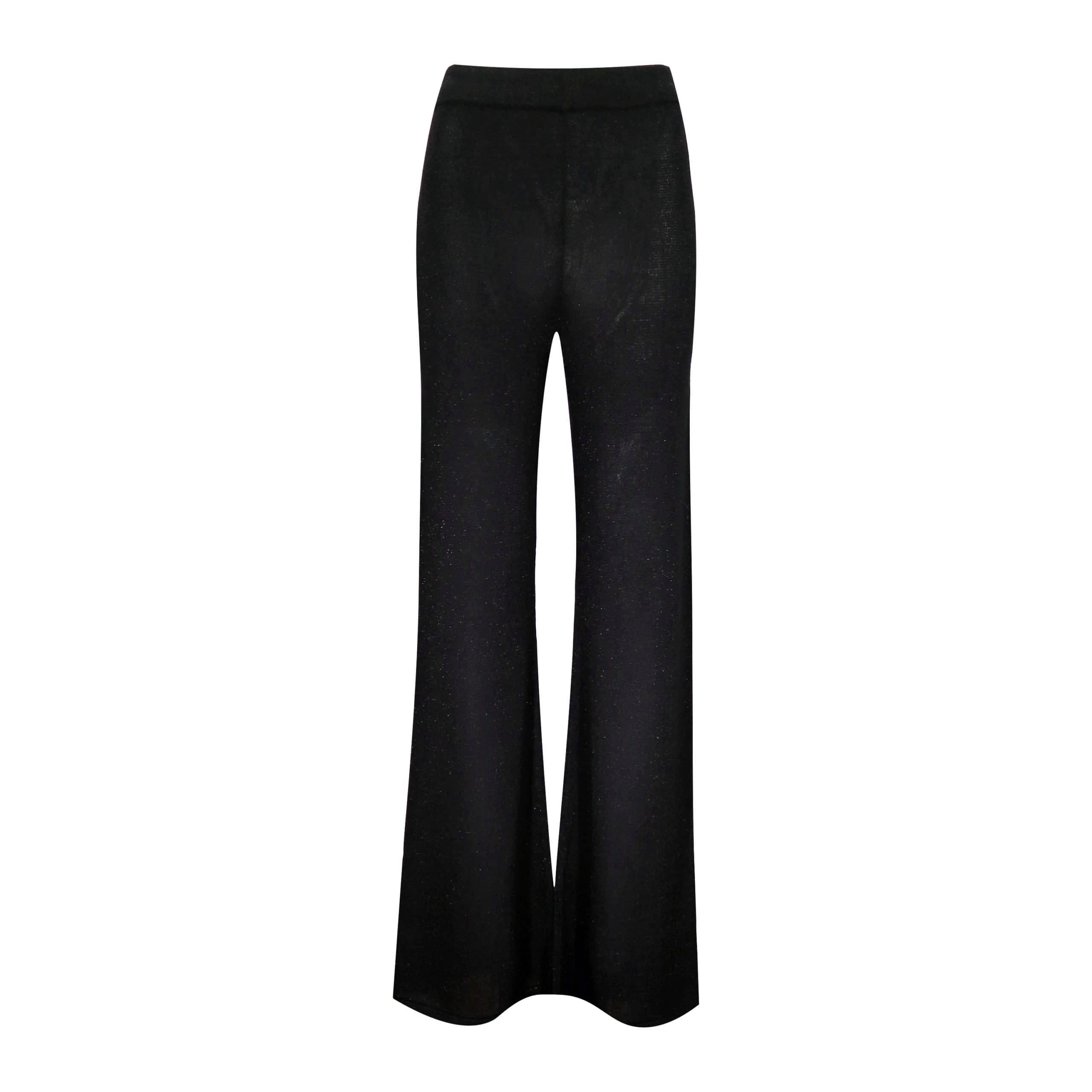 Relaxte flared pantalon van Frogbox by Princess, model knit pants with lurex. Deze broek is gemaakt van een zwarte fijn gebreide stof met een glittertje. De pantalon heeft flared broekspijpen en een hoge elastische taille.