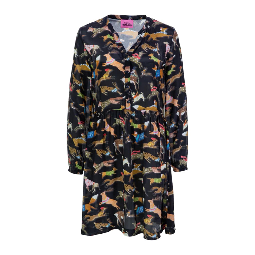 Zwart kleedje met dieren print van Frogbox goes Princess, model dress animals. Deze jurk is gemaakt van een gladde zwarte stof met een all over dieren print. De jurk heeft lange mouwen, V-hals met knoopjes en elastische manchetten.