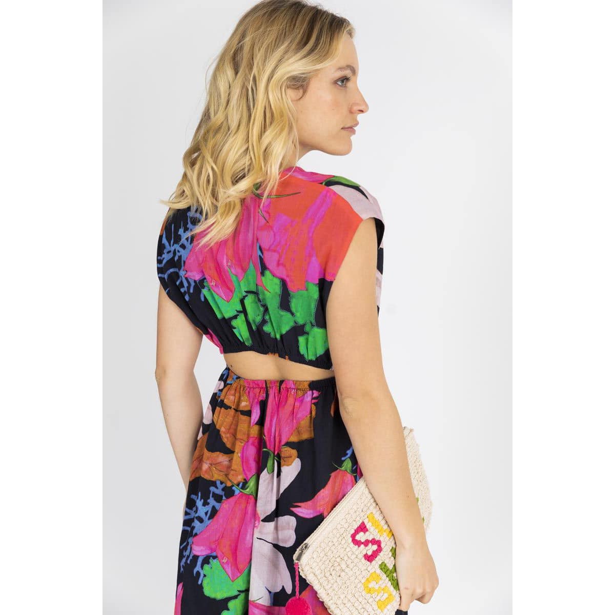 Fleurig maxi kleedje van Frogbox. Deze jurk is mouwloos, heeft een V-hals en een volant in de rok. De katoenen jurk heeft een relaxte pasvorm, elastische taille en een cut out onder aan de rug aan de achterzijde.