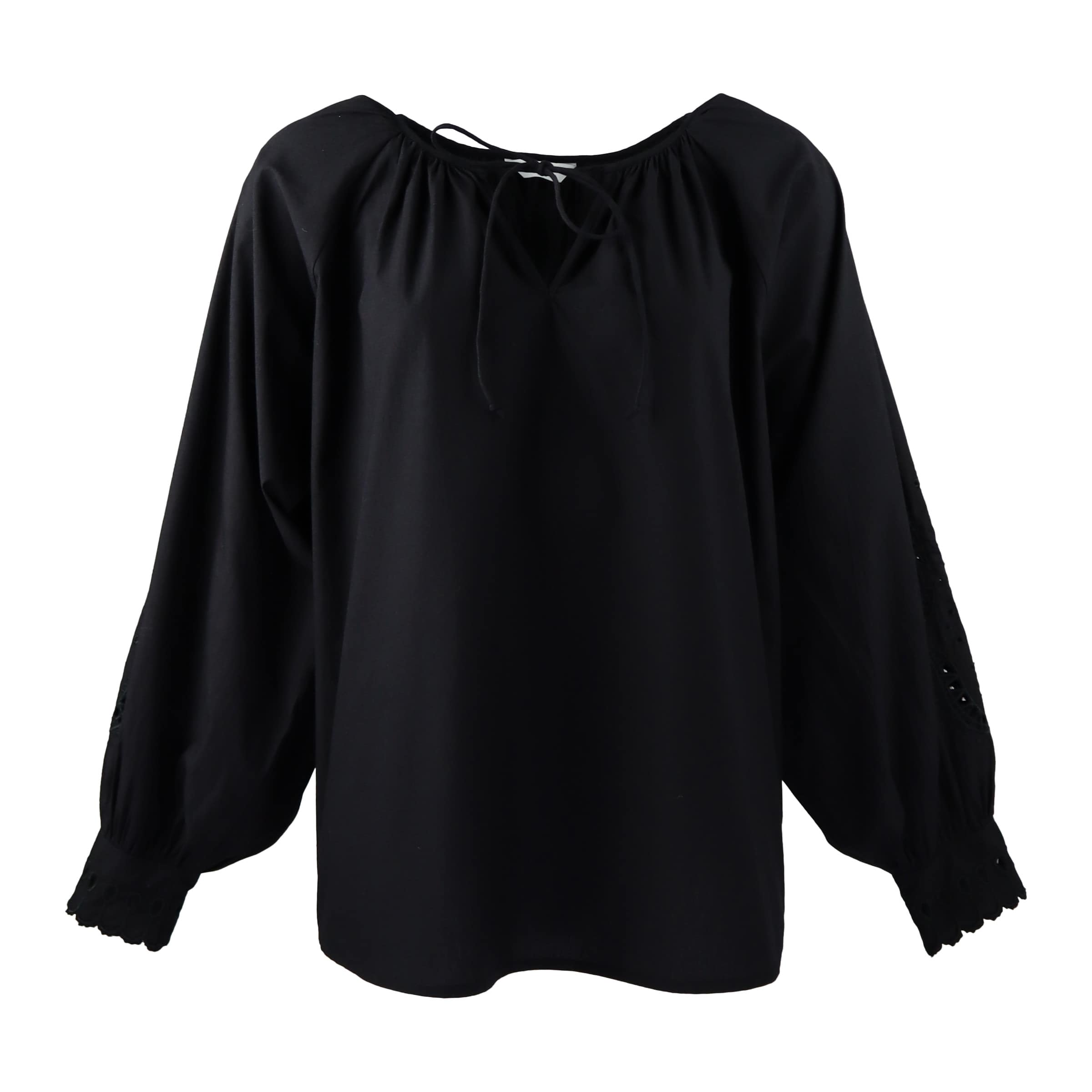 Zwarte tuniek van Frogbox goes Princess, model blouse with hole embroidery in nero. Deze tuniek heeft lange wijde mouwen, waarbij de onderzijde van de mouwen opengewerkt is, net zoals de manchetten. De los vallende blouse is gemaakt van katoen en heeft een V-hals met twee lintjes die je kunt strikken.