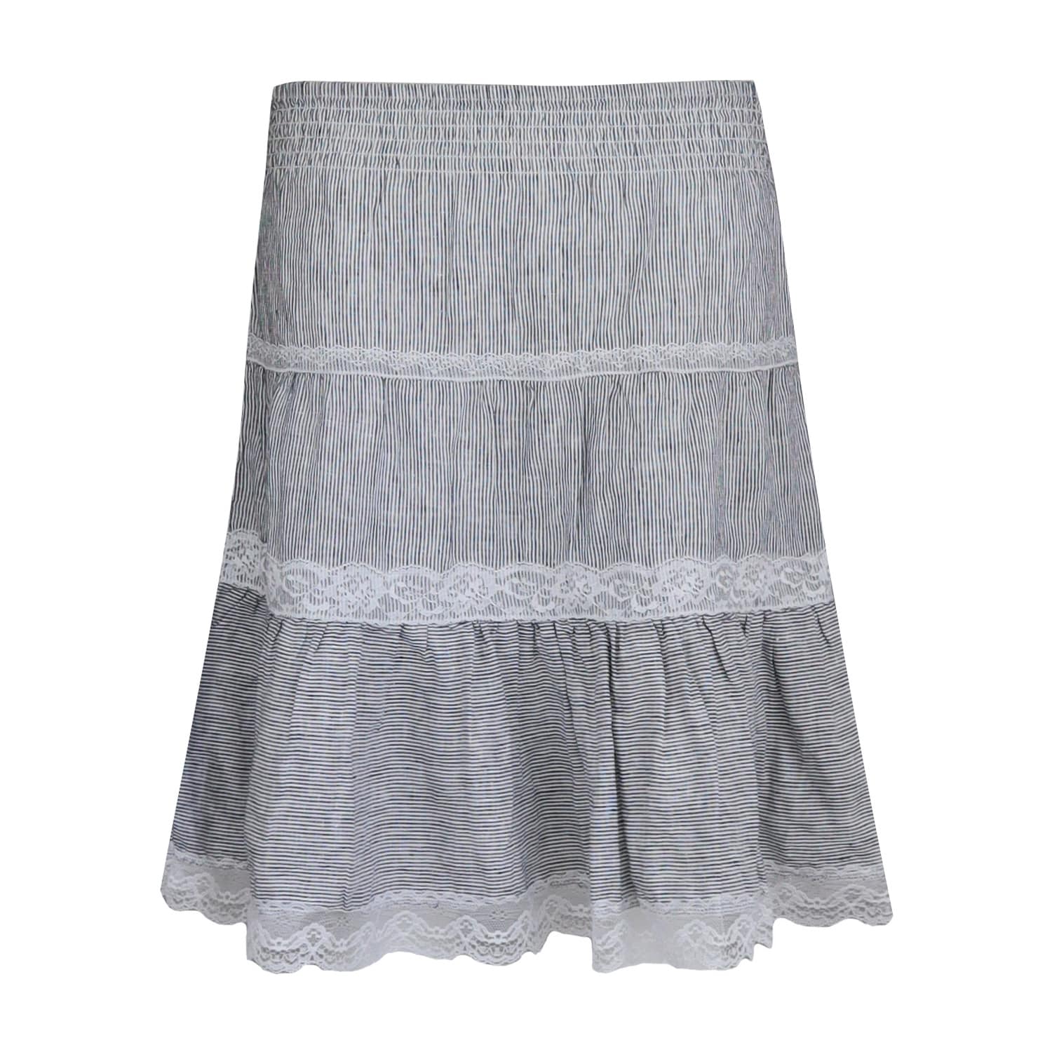 Linnen rok van Gold Hawk in mini linen stripe. Deze relaxte rok heeft een elastische taille en een uitlopende pasvorm. De rok is gemaakt van een gestreepte linnen stof met stroken wit kant.
