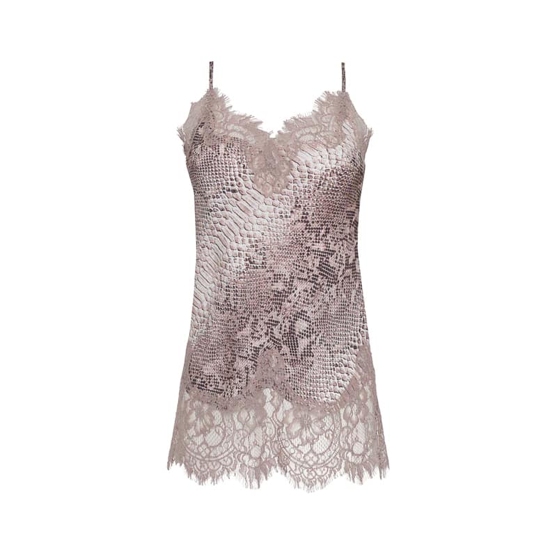 Zijden top van Gold Hawk, model Python Coco Silk Print Lace Cami in muted roze python. Deze roze top heeft aan de hals en zoom een kanten strook. De top is gemaakt van zijde en heeft een python print.