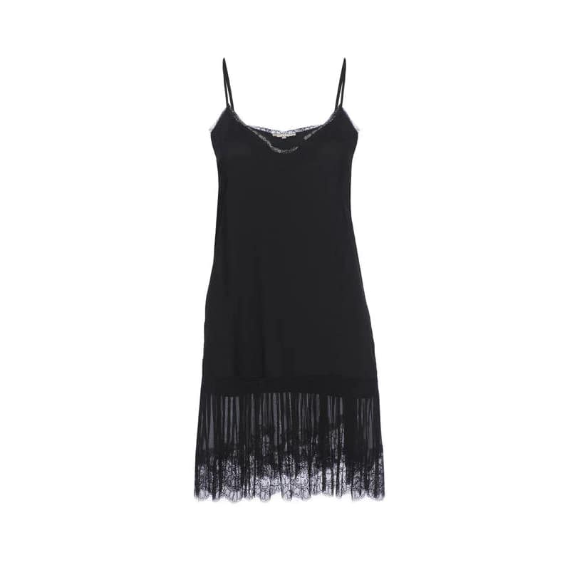 Zwarte zijden kleedje van Gold Hawk. Deze korte jurk is gevoerd en heeft verstelbare spaghettibandjes. De jurk heeft kant aan de borst en zoom. De onderzijde van de rok bestaat uit fijne plooien en is afgewerkt met een strook kant.