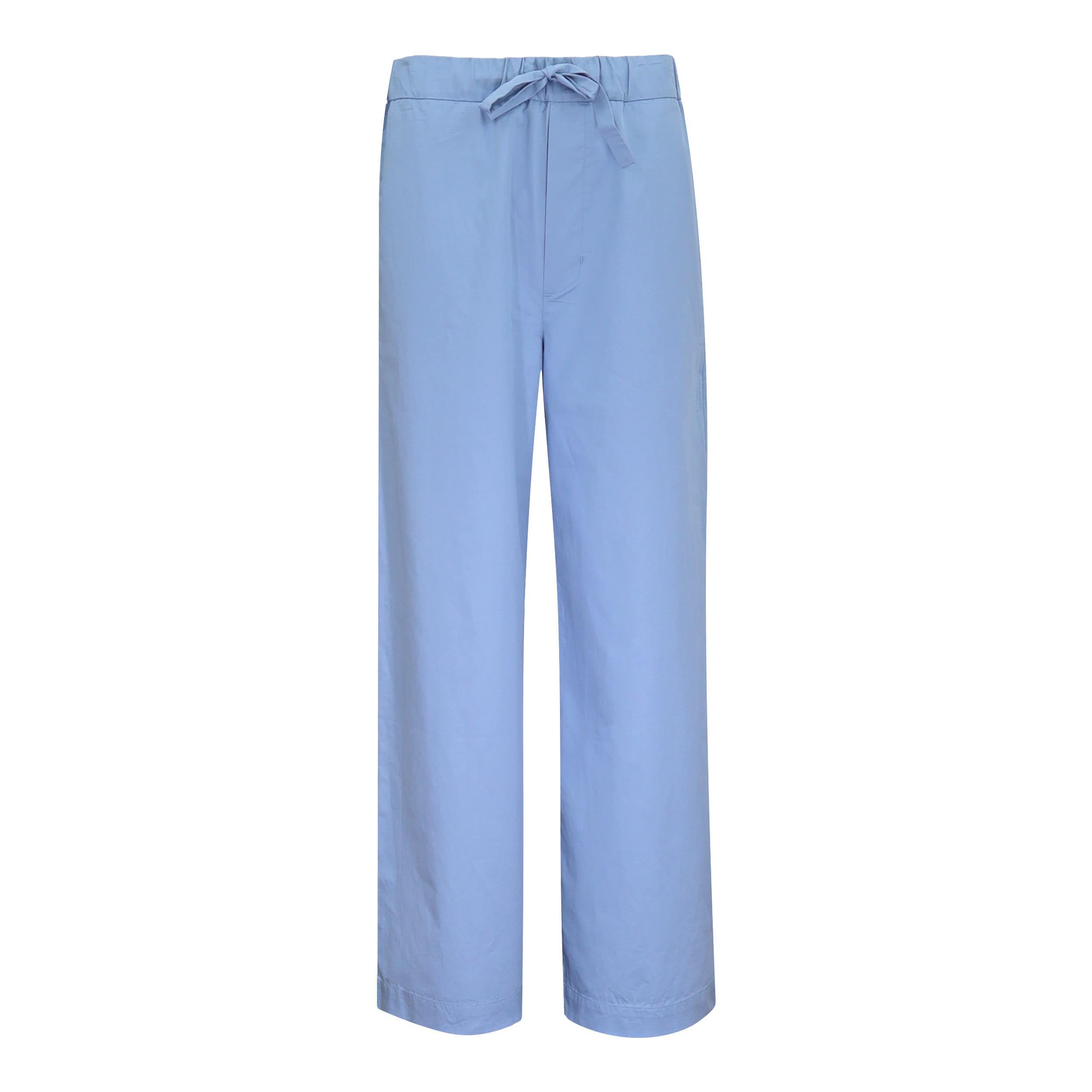 Blauwe, rechte pantalon van Graumann, model Magda pants in ocean. Deze lichtblauwe pantalon is gemaakt van poplin katoen met satijnlook en heeft een elastische taille met trekkoord. De pantalon heeft een rechte, wijde pasvorm, hoge taille, twee steekzakken en een sier paspelzakje.
