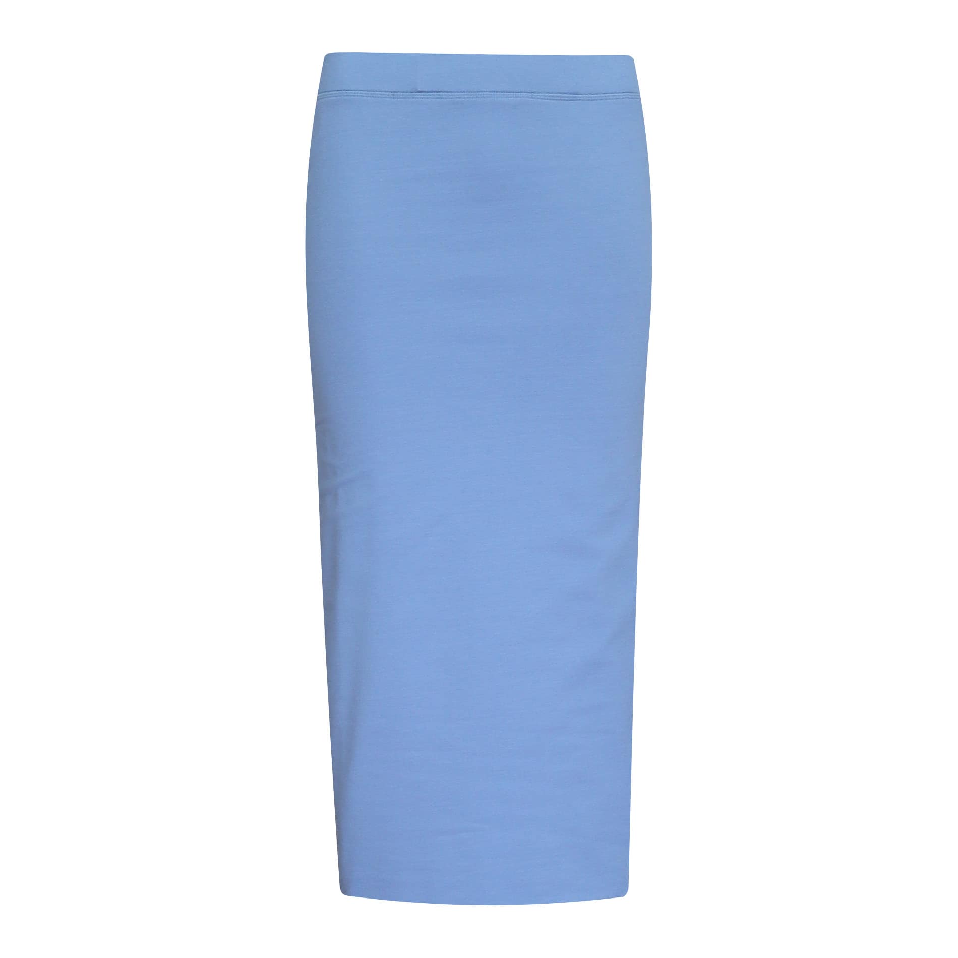 Blauwe midi rok van Graumann, model Paloma skirt in ocean. Deze lichtblauwe rok is gemaakt van katoenen stretch stof en heeft een elastische taille. De rok heeft een rechte pasvorm en valt op de kuiten.