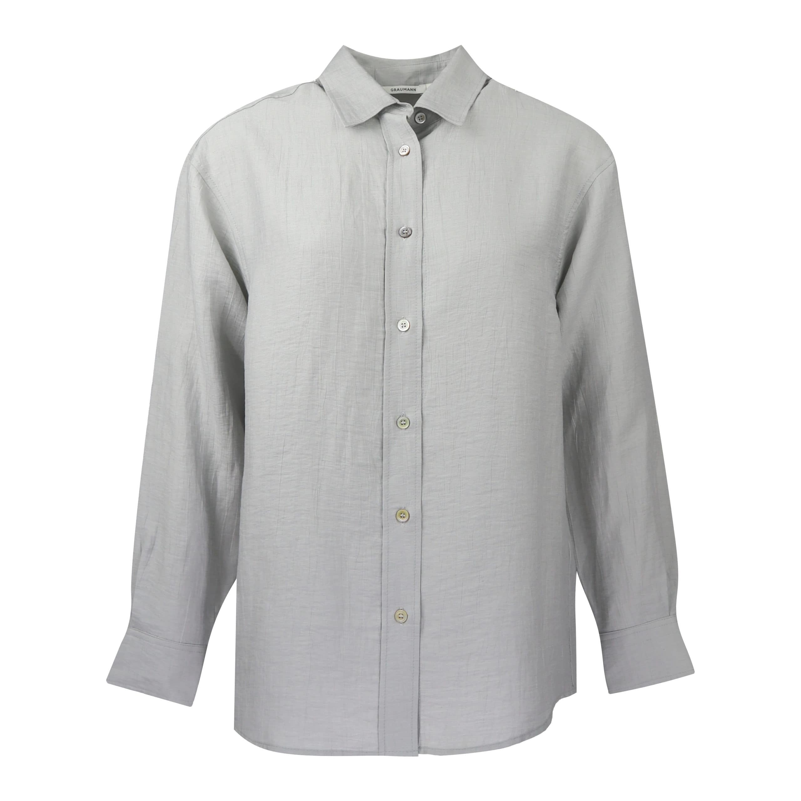 Grijze blouse van Graumann, model Lue shirt. Deze blouse is gemaakt van een linnen mix (crashed linnen) met een fijne structuur en heeft een losse pasvorm. De blouse heeft lange mouwen en sluit met een knoopsluiting aan de voorzijde.