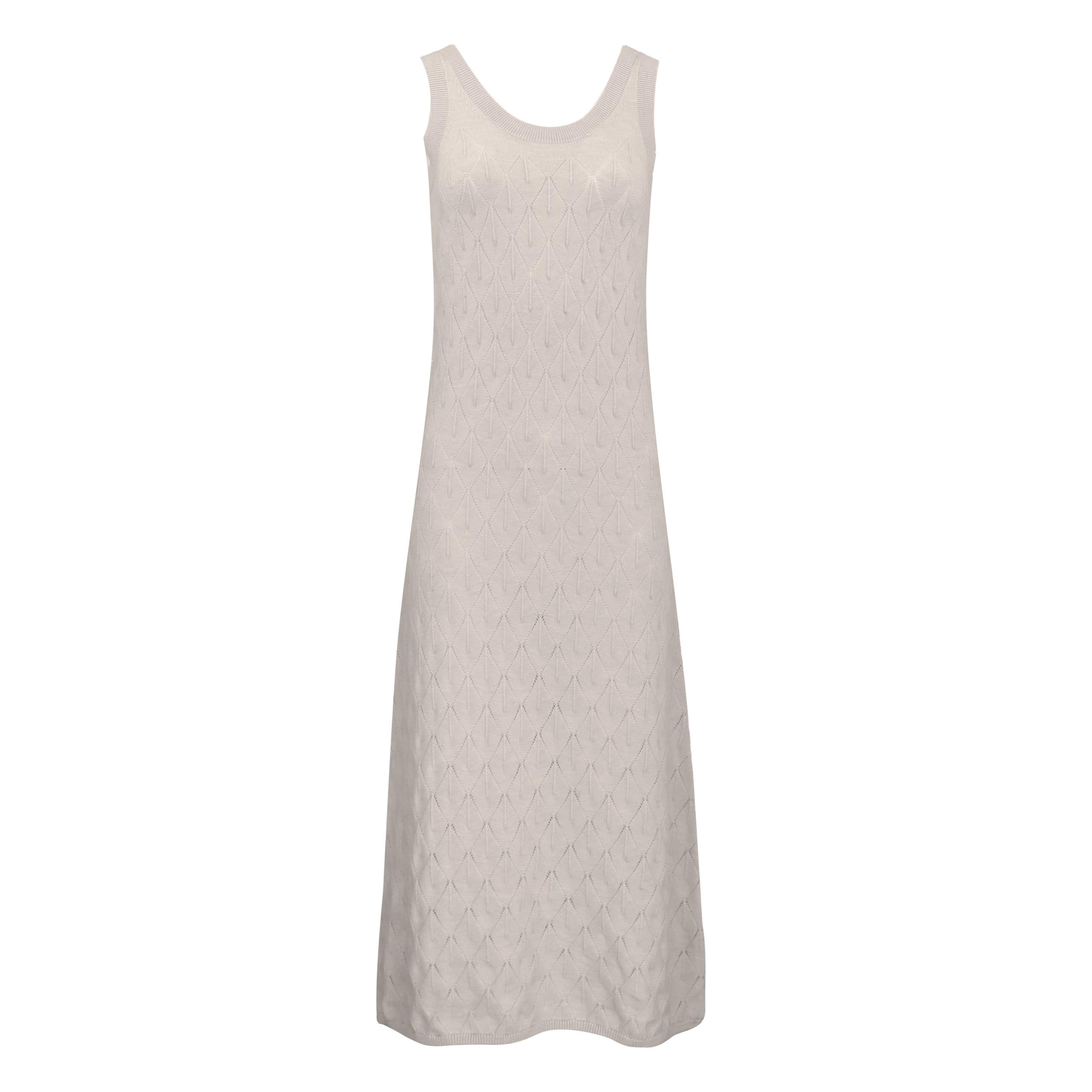Merino wollen kleedje van Graumann, model Frida Dress in Soft Merino Coco. Deze midi jurk is gemaakt van fijngebreide merino wol met een motief. De beige jurk is mouwloos, heeft een ronde hals en valt op de kuiten.