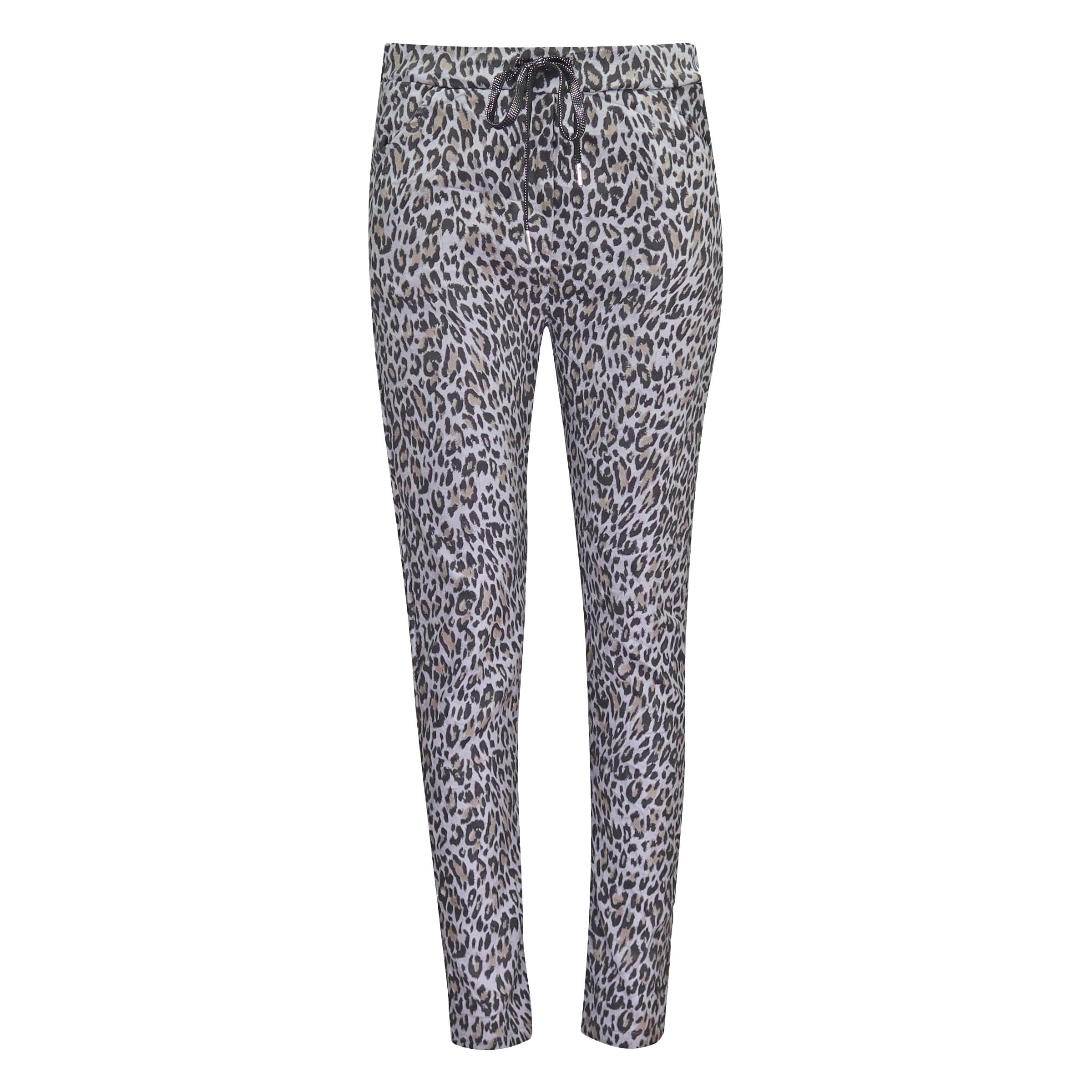 Grijze broek van Heartkiss in luipaard. Deze broek heeft een elastische taille met trekkoord en is gemaakt van een soepelvallende luipaard stof. De broek heeft twee steekzakken.