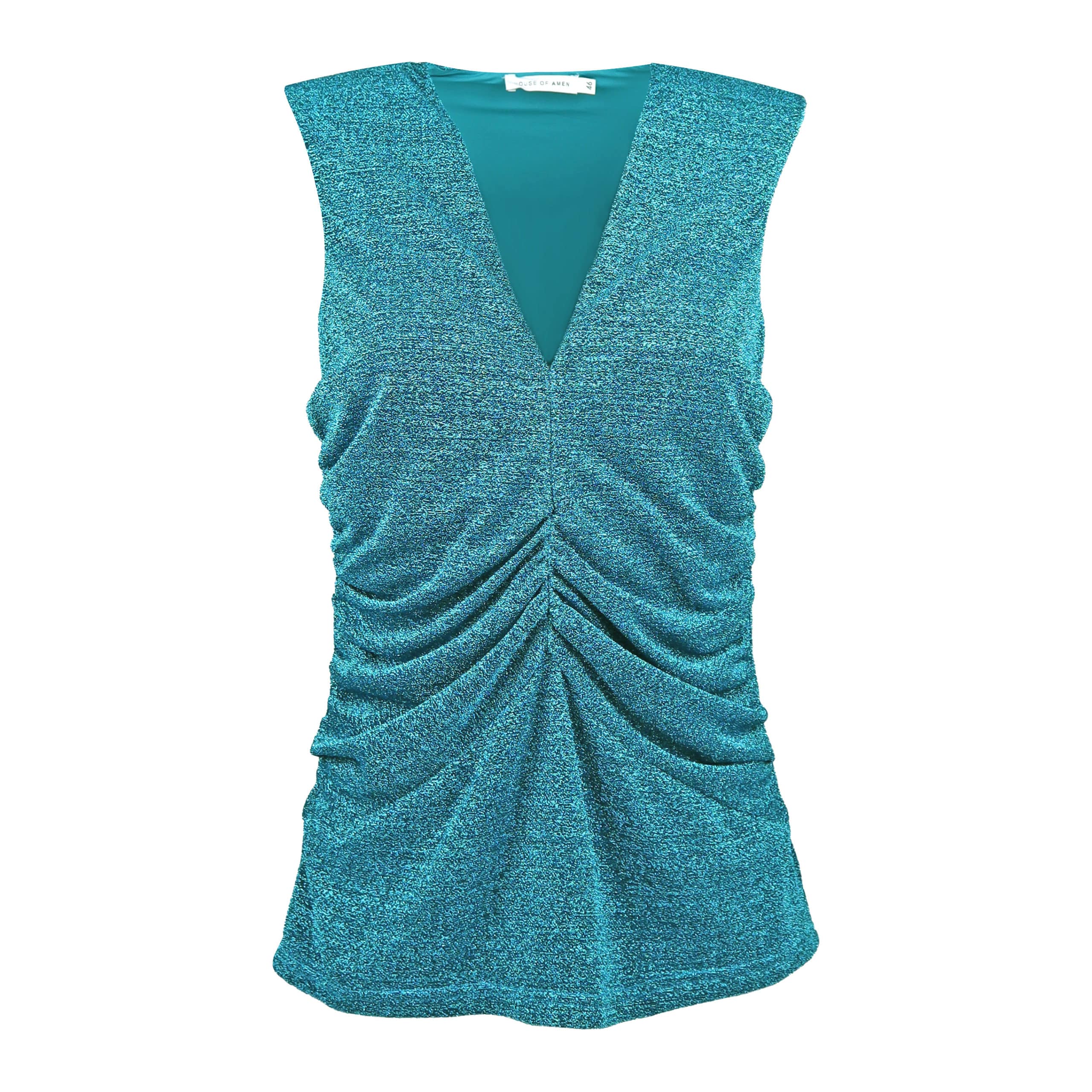 Blauwe top van House of Amen. Deze aansluitende top is gevoerd en gemaakt van een lurex stretch stof met een glittertje. De top heeft een V-hals, geplooide voorzijde en schoudervullingen.