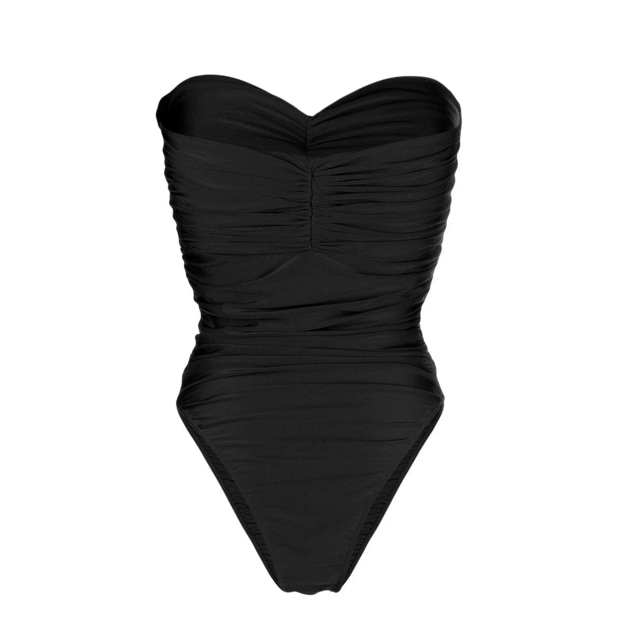 Zwart strapless badpak van House of Amen in black. Dit badpak is gemaakt van zwarte elastische stof met een licht glimmende afwerking. Het badpak is geplooid en heeft aan de voorzijde een cut out.