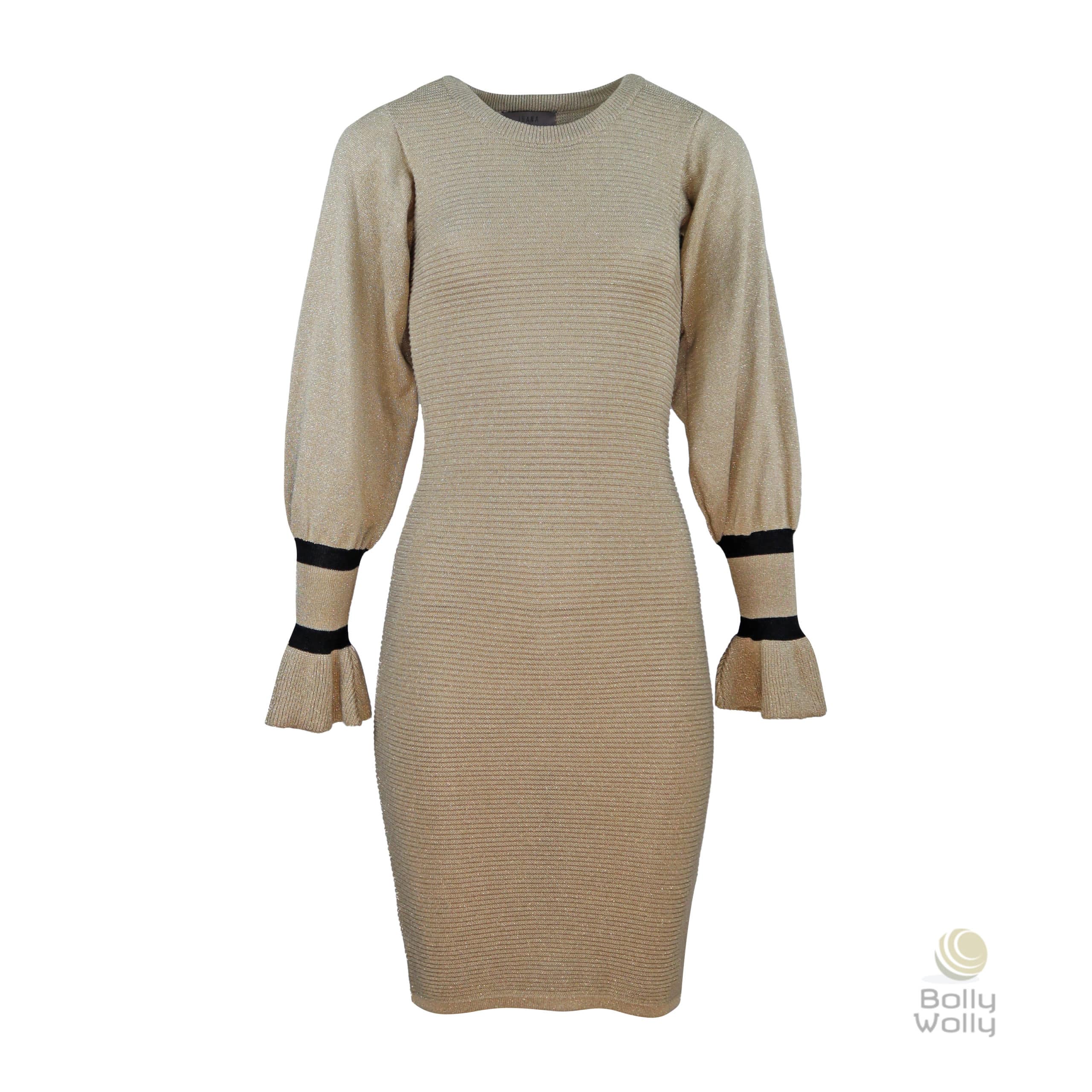 Aansluitend kleedje van Ibana in beige. Deze jurk is gemaakt van een gebreide lurex stretch stof waar een goudkleurige metalic draad in verwerkt is. De jurk heeft een aansluitende pasvorm, wijde langere mouwen met lange smalle aansluitende manchetten en valt op de knie.