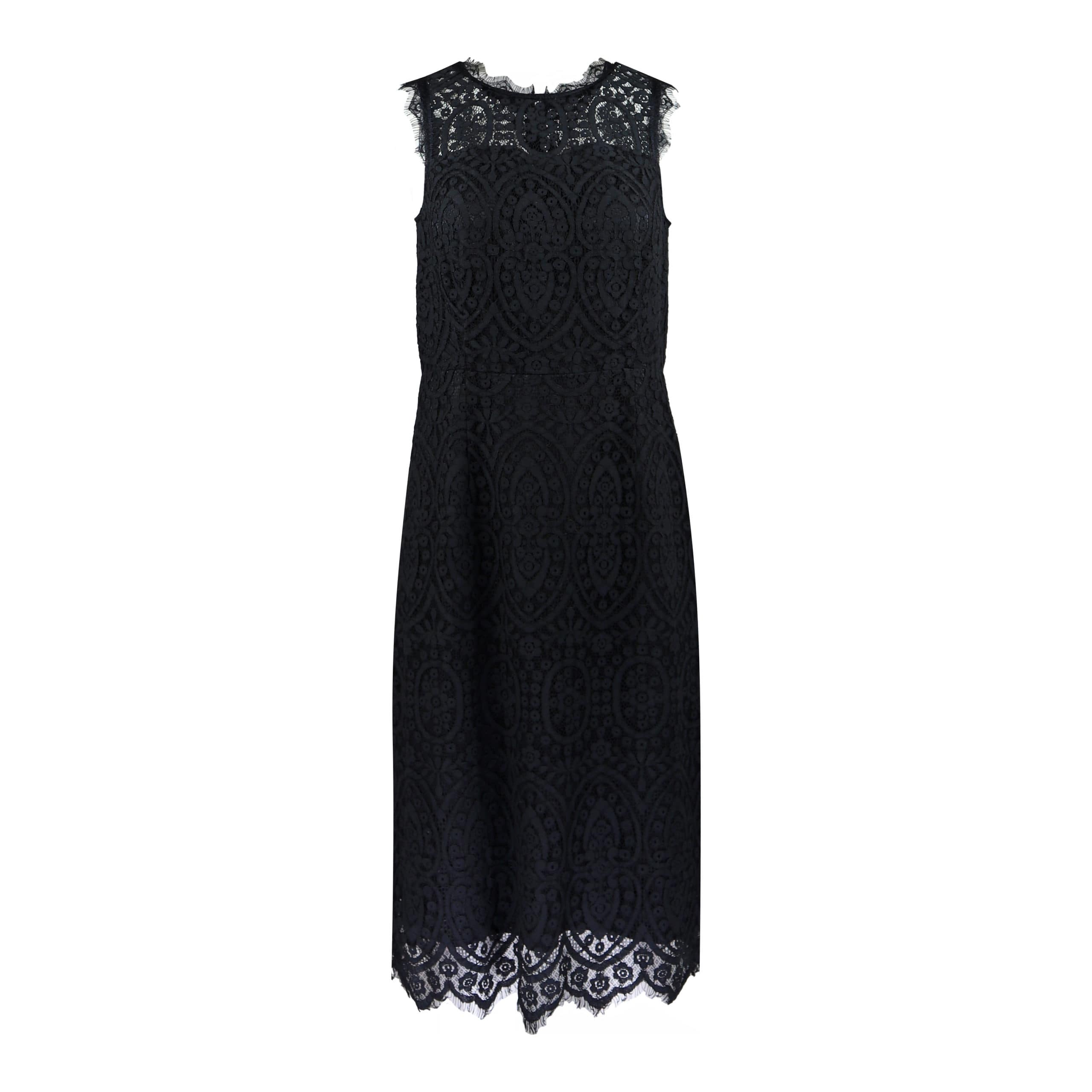 Zwarte kanten kleedje van Ibana. Deze mouwloze jurk heeft een kanten bovenlaag en is hieronder gevoerd. De jurk sluit met een verborgen ritssluiting aan de achterzijde en is getailleerd.