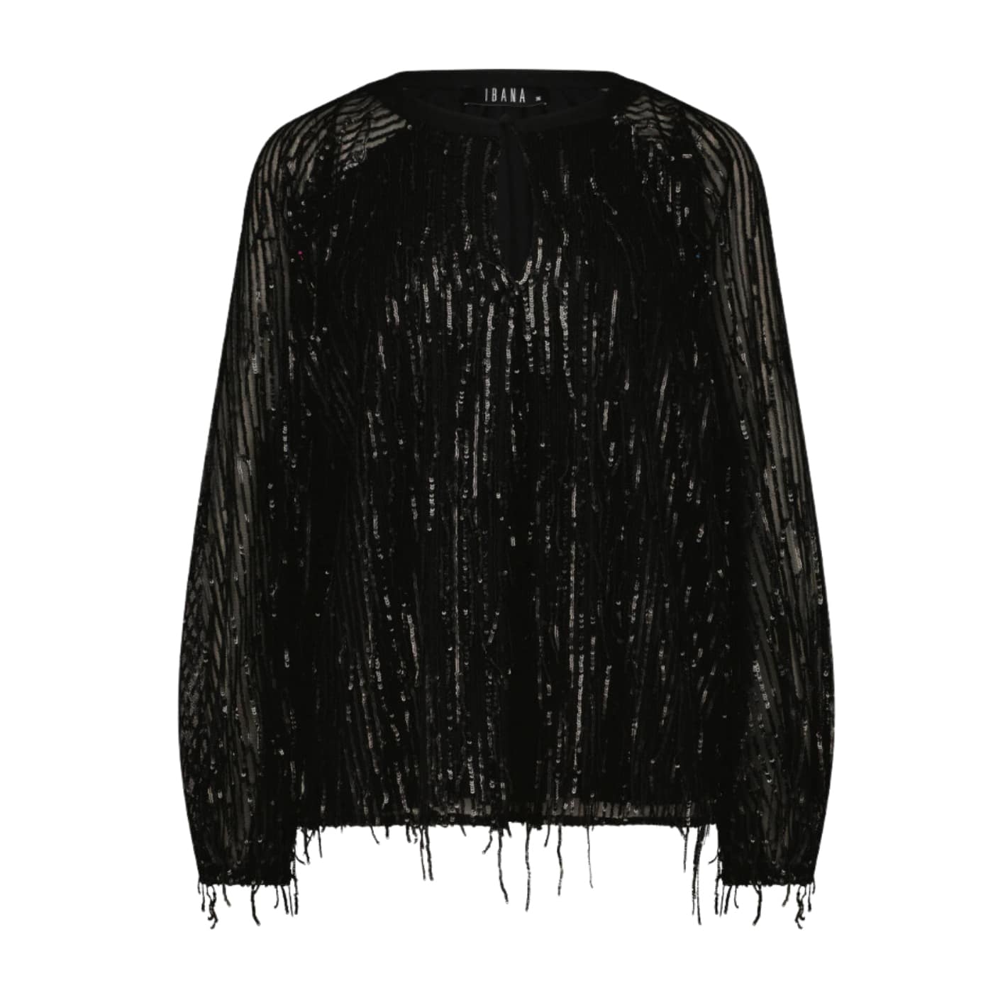 Pailletten blouse van Ibana, model Folette in blauw. Deze blouse is gevoerd, heeft een losvallende pasvorm en geheel bezet met glimmende pailletten met franjes. De blouse sluit met een klein knoopje aan de voorzijde met een keyhole. Je kunt het knoopje ook openlaten.