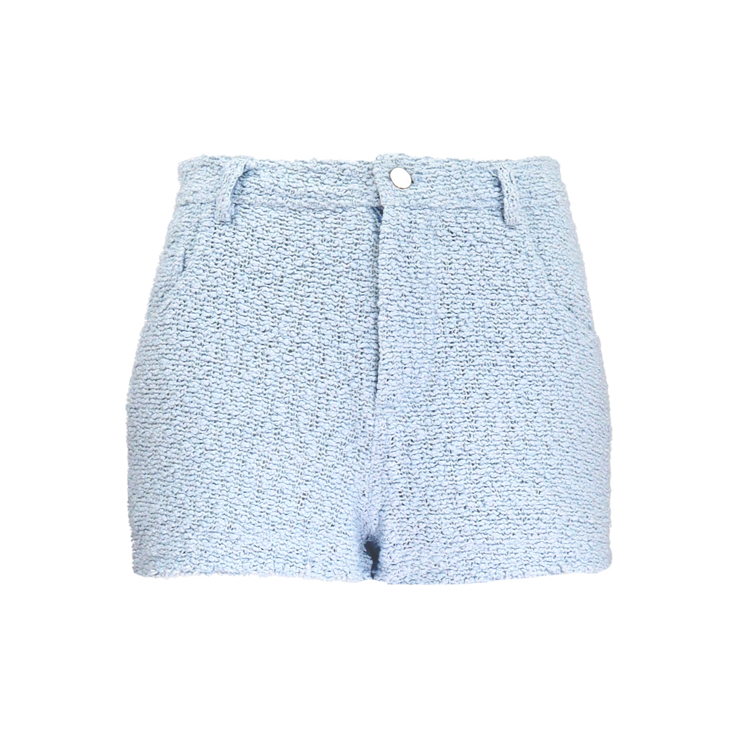 Lichtblauwe short van IRO, model Daphna in fogged blue. Deze korte broek is gemaakt van een lichtblauwe tweed stof, heeft twee steekzakken en twee achterzakken. De short sluit met een knoop- en ritssluiting.