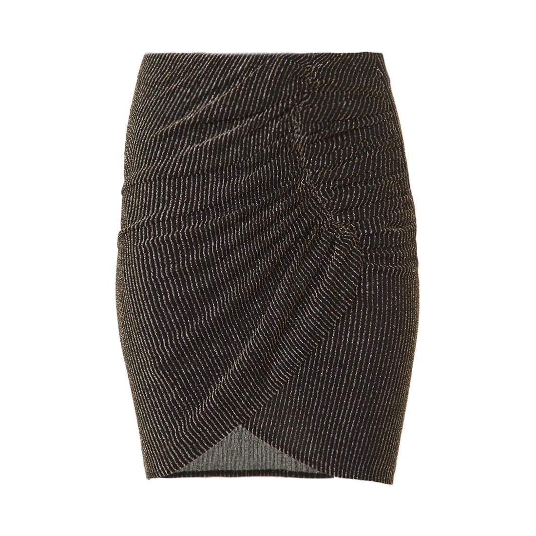 Mini rok van IRO, model Tacite. Deze korte rok is gemaakt van een zwarte stretch stof met metalic strepen. De rok heeft een elastische taille, vaste overslag en aansluitende pasvorm.