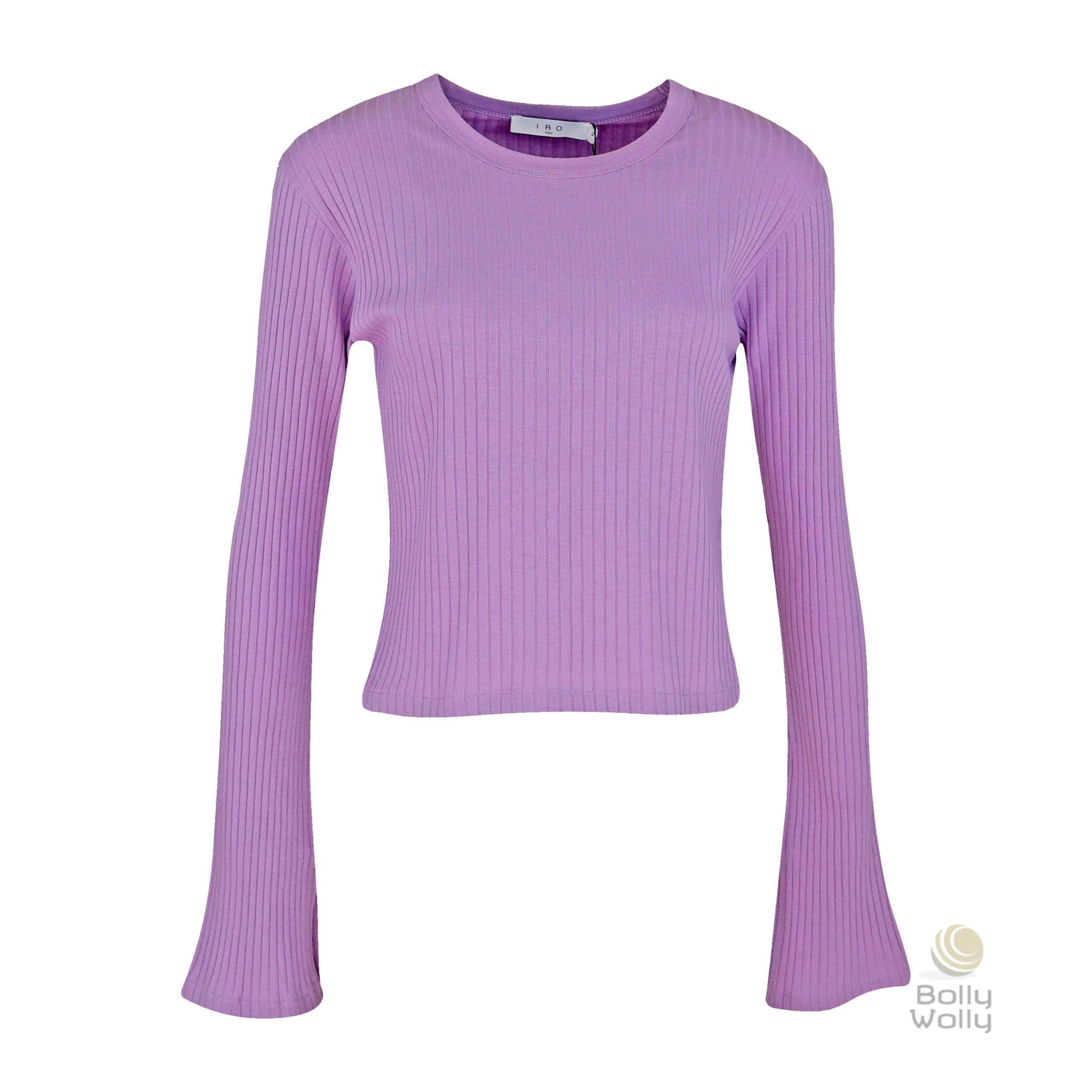 Paars shirt van IRO, model Ersilia in vintage purple. Dit katoenen shirt is gemaakt van een geribbelde stof en heeft een aansluitende pasvorm. Het shirt heeft een ronde hals, extra lange flared mouwen met splitjes.