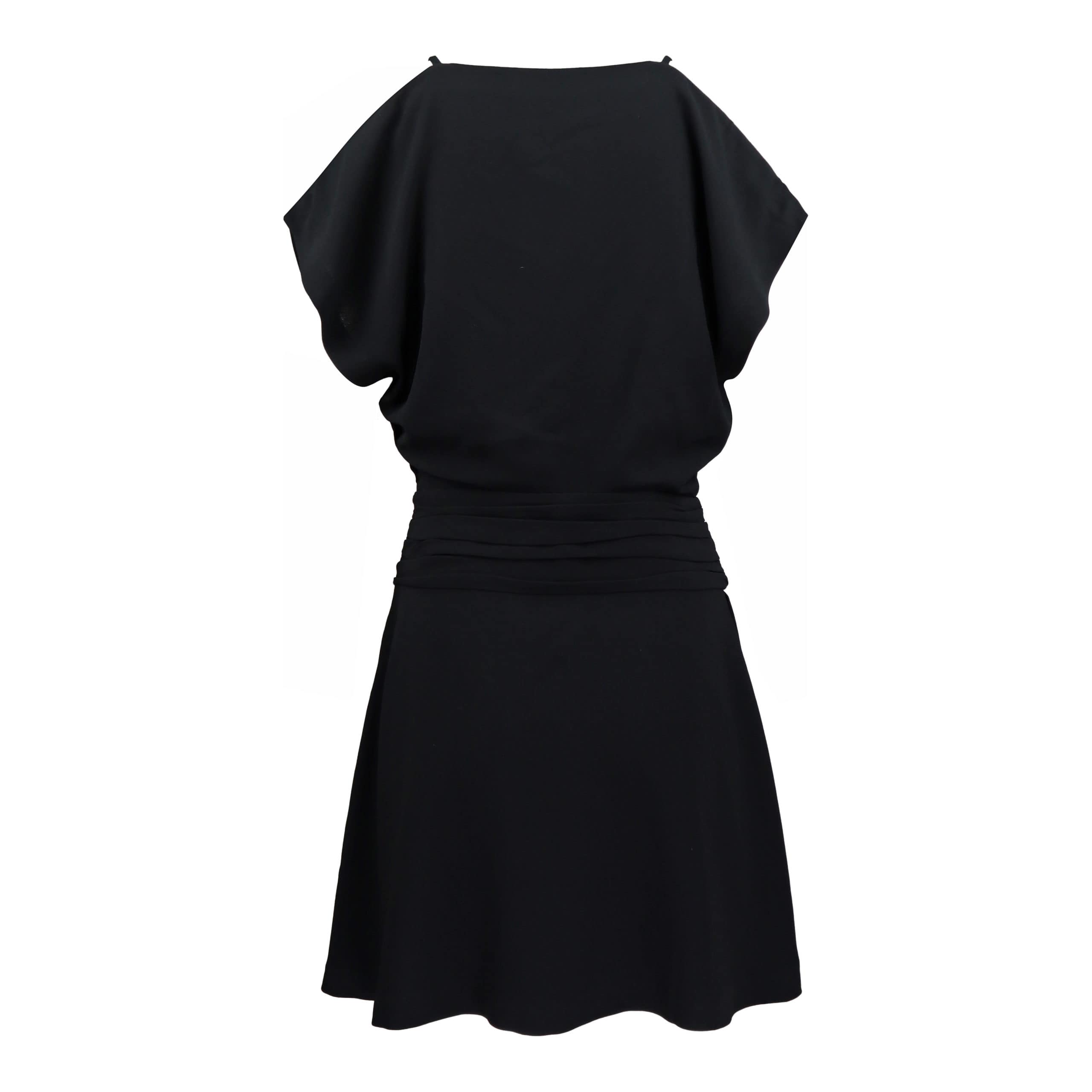 Zwart mini kleedje van IRO, model Editan. Deze jurk is gemaakt van een effen zwarte stof met open schouders en korte mouwen. De korte jurk sluit met een verborgen ritssluiting aan de zijkant, heeft een verhoogde geplooide taille en V-hals.