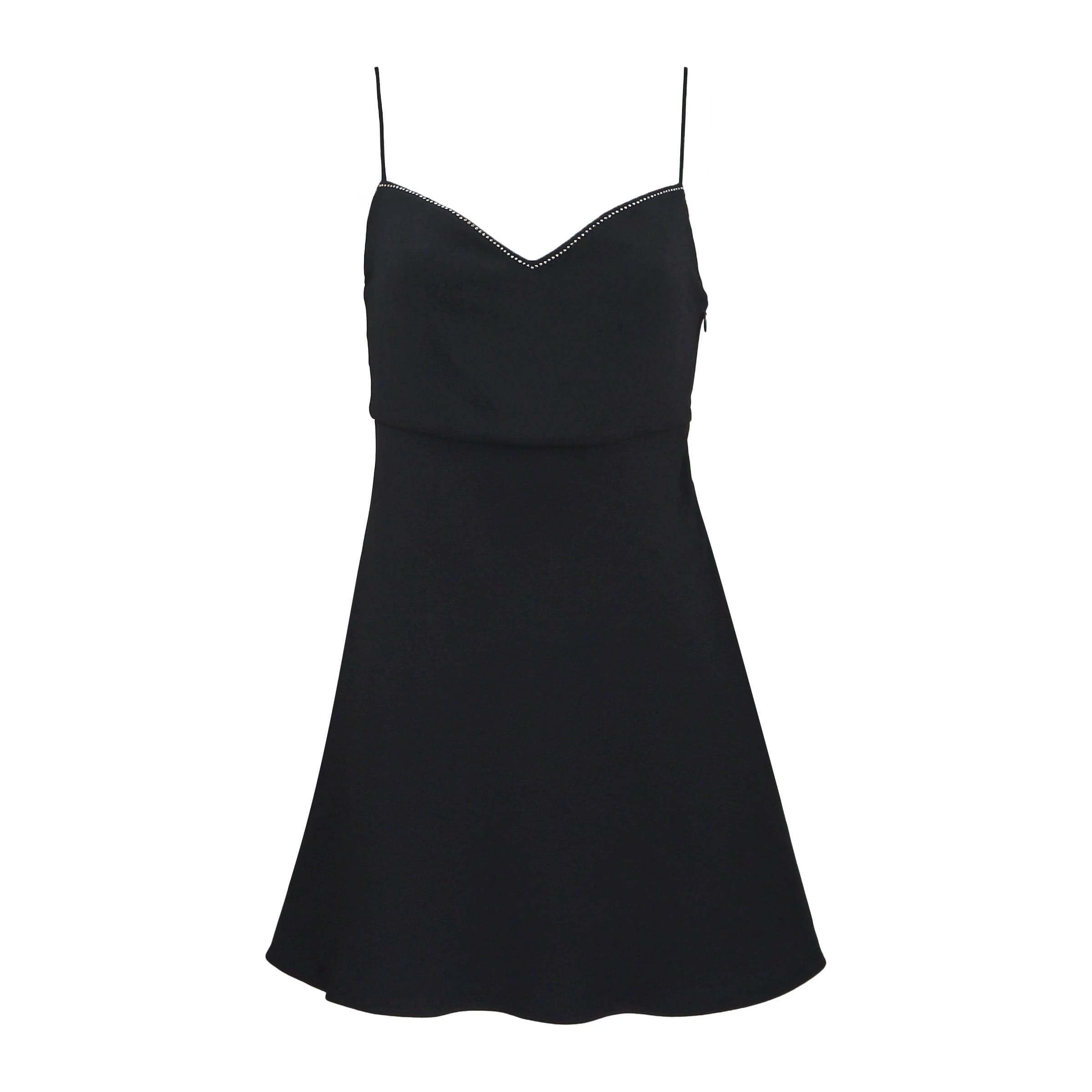 Zwart mini kleedje van IRO, model Phebie. Deze slim fit jurk is gemaakt van een effen zwarte stof met aan de lage V-hals kleine glimmende steentjes. De korte jurk sluit met een verborgen ritssluiting aan de zijkant en heeft spaghettibandjes.