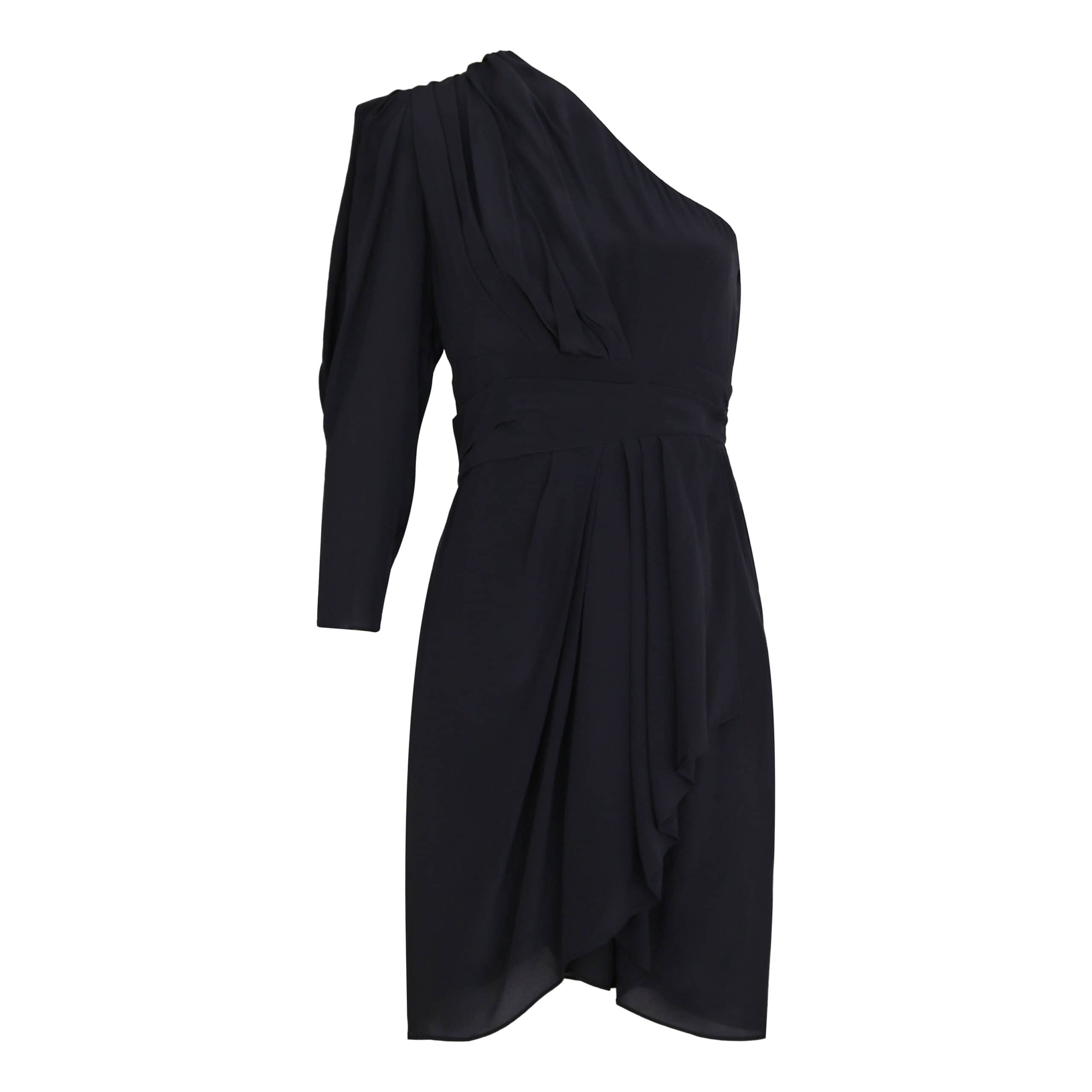 Zwart mini kleedje van IRO, model Giullia. Deze jurk is gemaakt van een effen zwarte zijden stof met aan een zijde een open schouder. De korte jurk sluit met een verborgen ritssluiting aan de zijkant, heeft een verhoogde geplooide taille en een overslag rok.