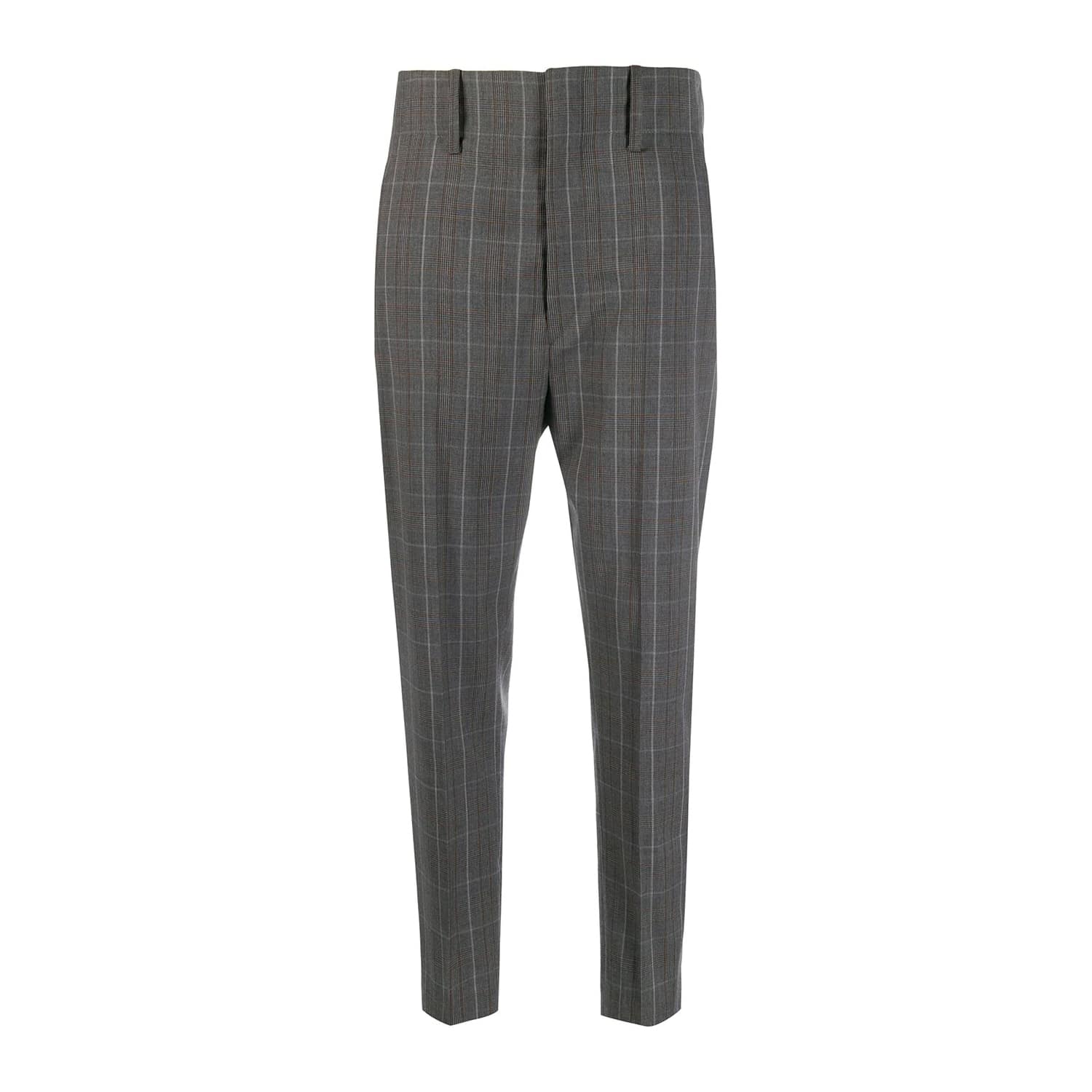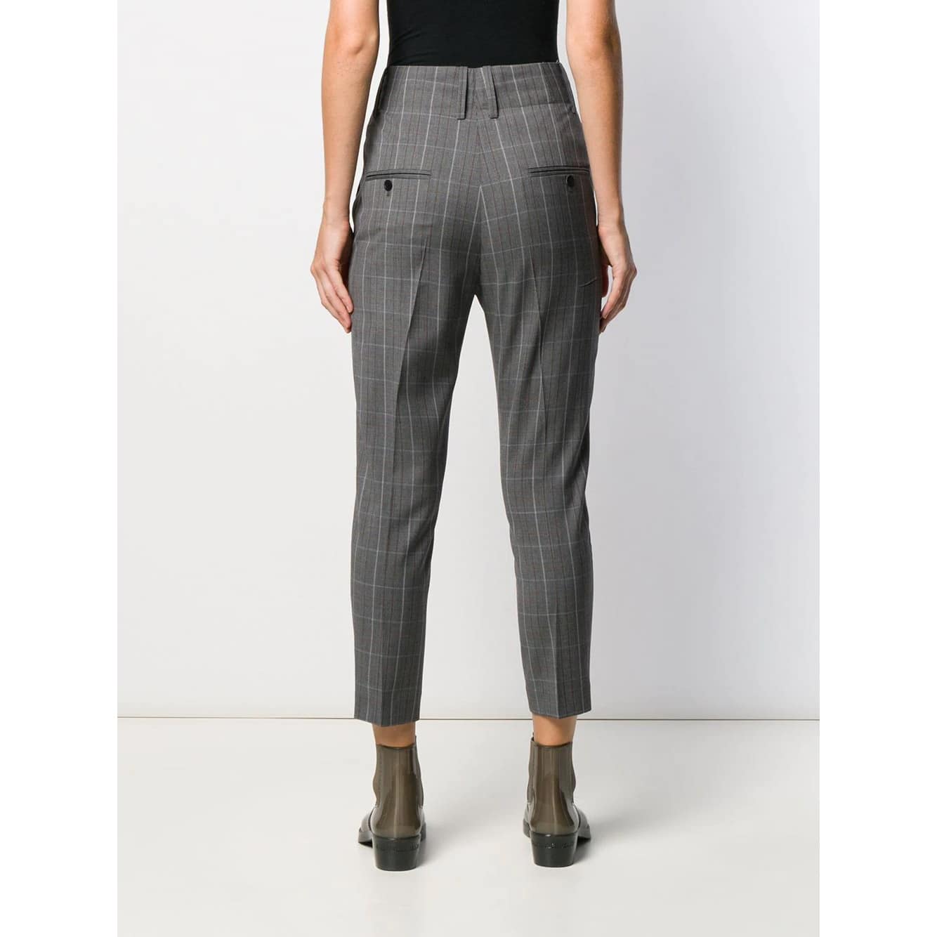 Grijze geruite pantalon van Isabel Marant Etoile, model Noah. De stof van deze broek is gemaakt van 100% wol en heeft een geruit patroon. Deze pantalon sluit met een haakje, knoop- en ritssluiting en heeft twee steekzakken aan de voorzijde en twee paspelzakken aan de achterzijde. De broek heeft een hoge taille met cropped toelopende broekspijpen.