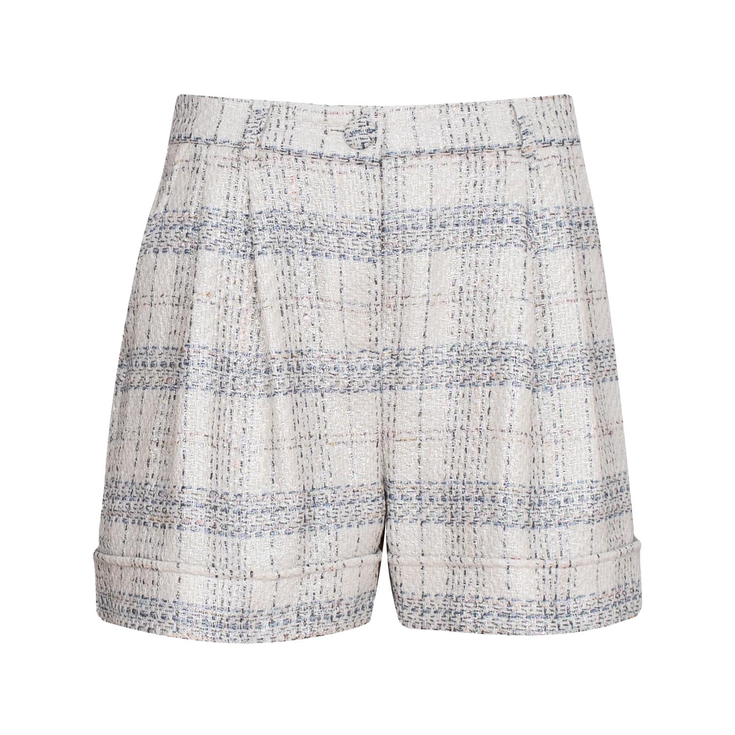 Short van Janice, model Arthur off white metallic. Deze korte broek is gemaakt van een geruite, tweed stof met een subtiele doorschijnende metalic coating, heeft een vaste omslag en is geplooid in de tailleband. De short sluit met een knoop- en ritssluiting, heeft twee steekzakken en aan de achterzijde paspelzakjes.