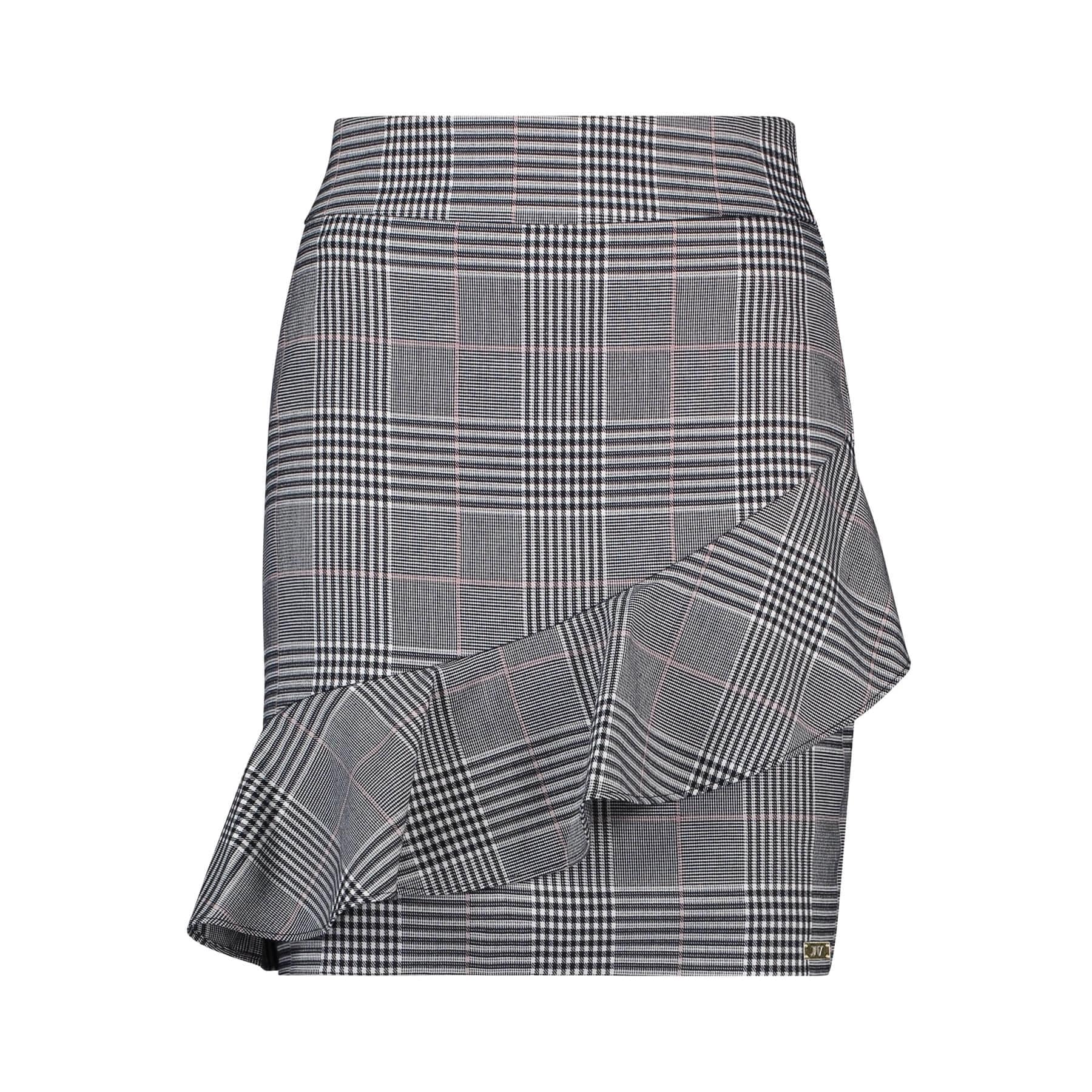 Geruite rok van Josh V, model Roxan. Deze korte rok heeft een aansluitende pasvorm met aan de voorzijde een ruffle. De rok sluit met een verborgen ritssluiting aan de achterzijde.