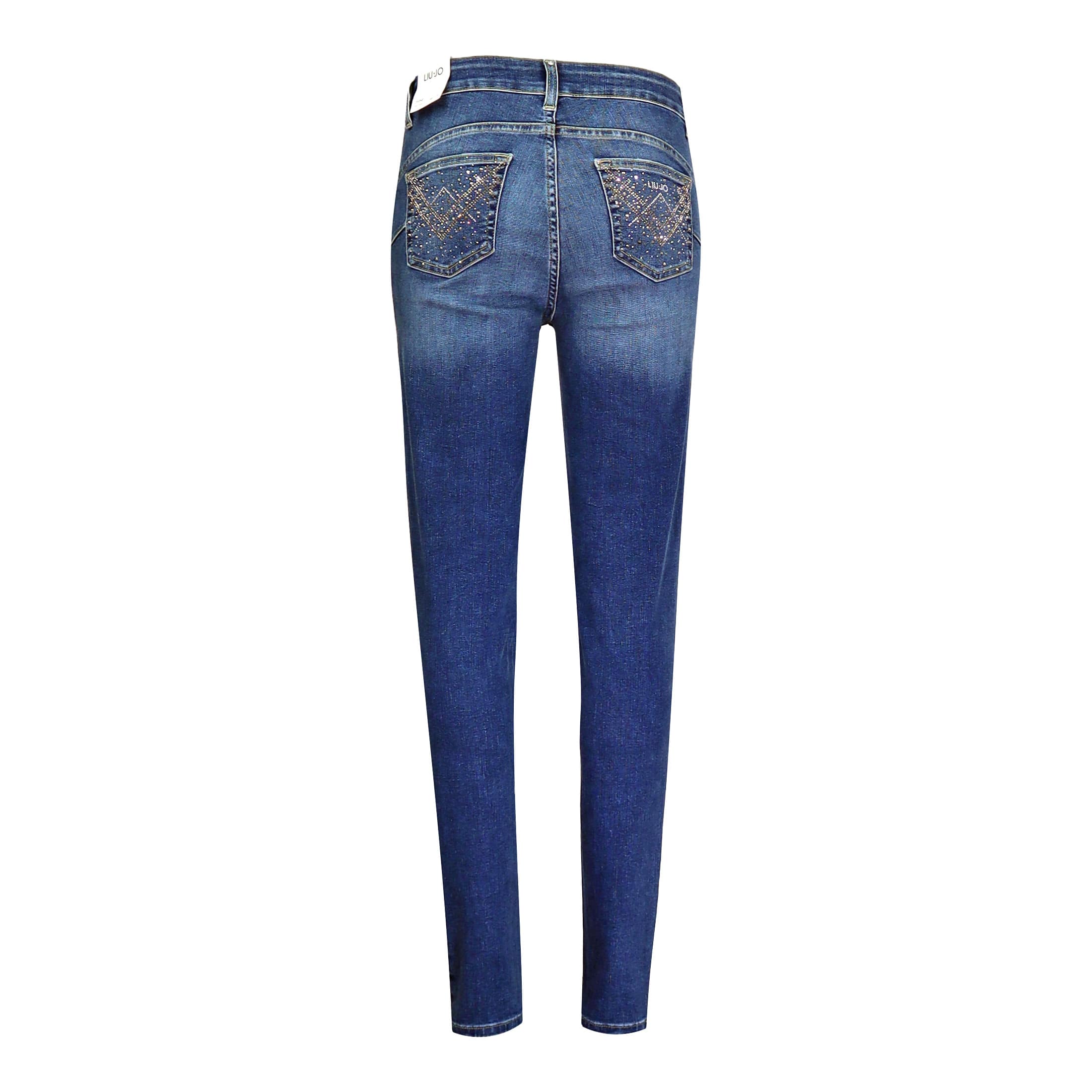Blauwe jeans van Liu Jo, model bottom up divine high waist in denim blue. Deze denim broek heeft een slim fit pasvorm met een hoge taille. De broek sluit met een knoop- en ritsslutiing, heeft twee steekzakken en twee achterzakken die versiert zijn met steentjes.