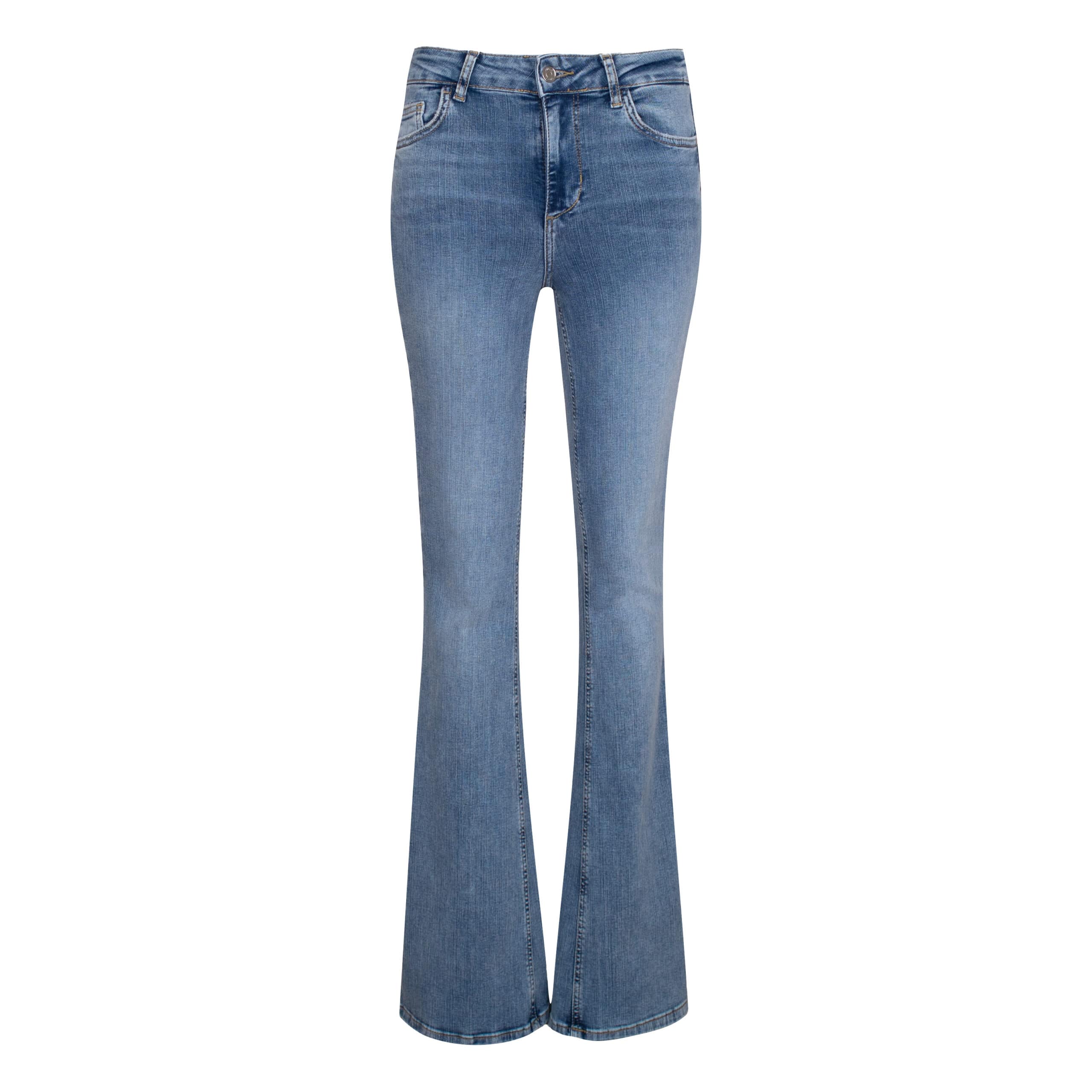 Blauwe jeans van Liu Jo, model bottom up beat high waist in denim blue sw ma. Deze denim broek is gemaakt van denim stretch stof en heeft een boot cut pasvorm. De broek sluit met een knoop- en ritssluiting, heeft twee steekzakken, waarvan een steekzak versiert is met het Liu Jo logo, en twee achterzakken.