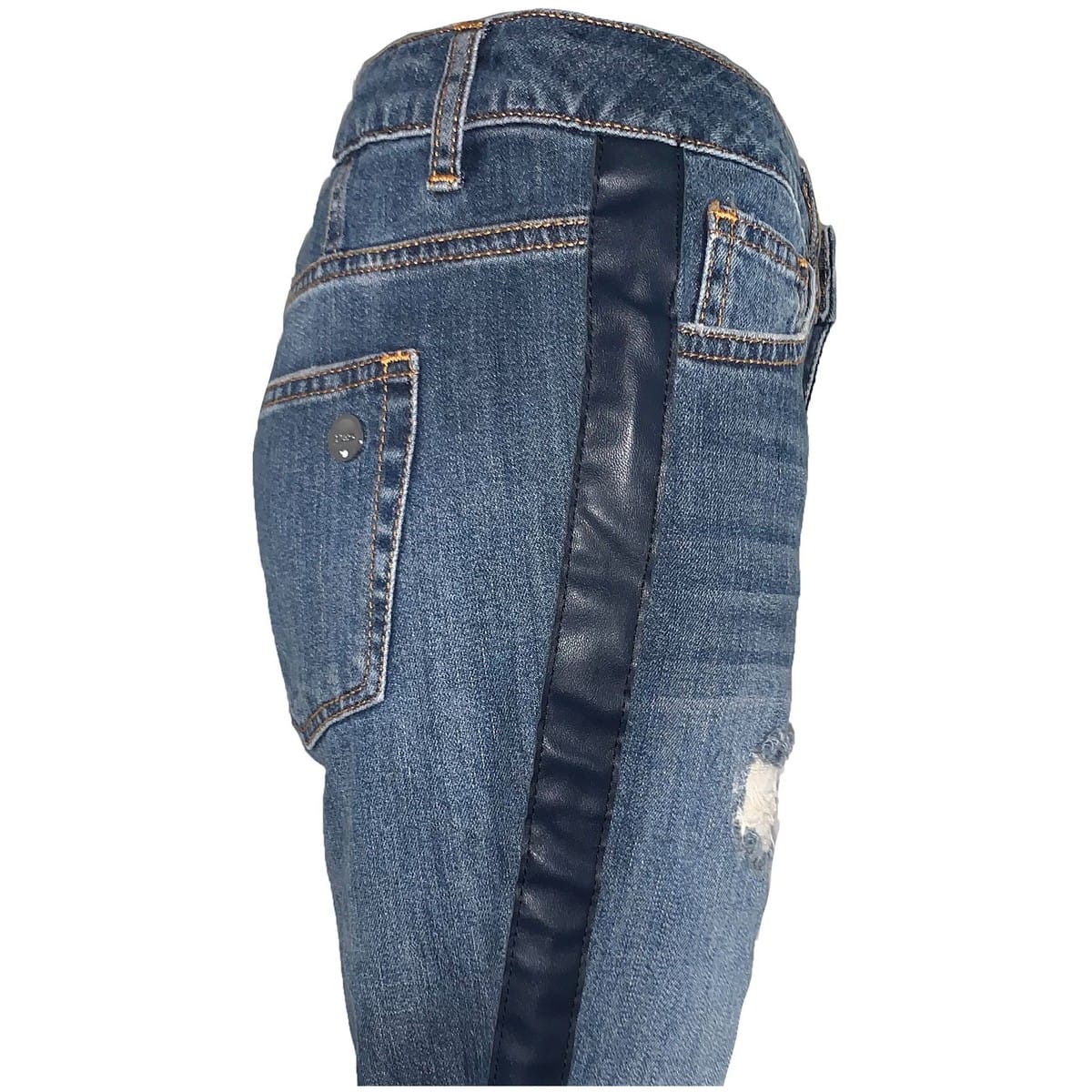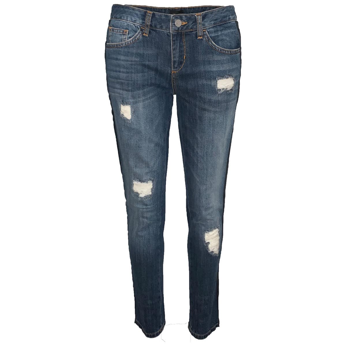 Blauwe jeans van Liu Jo. Deze slim fit denim broek heeft aan de voorzijde diverse beschadigingen en een lichte wassing. Aan beide zijkanten van de broekspijpen zit een stoere donkerblauwe bies.