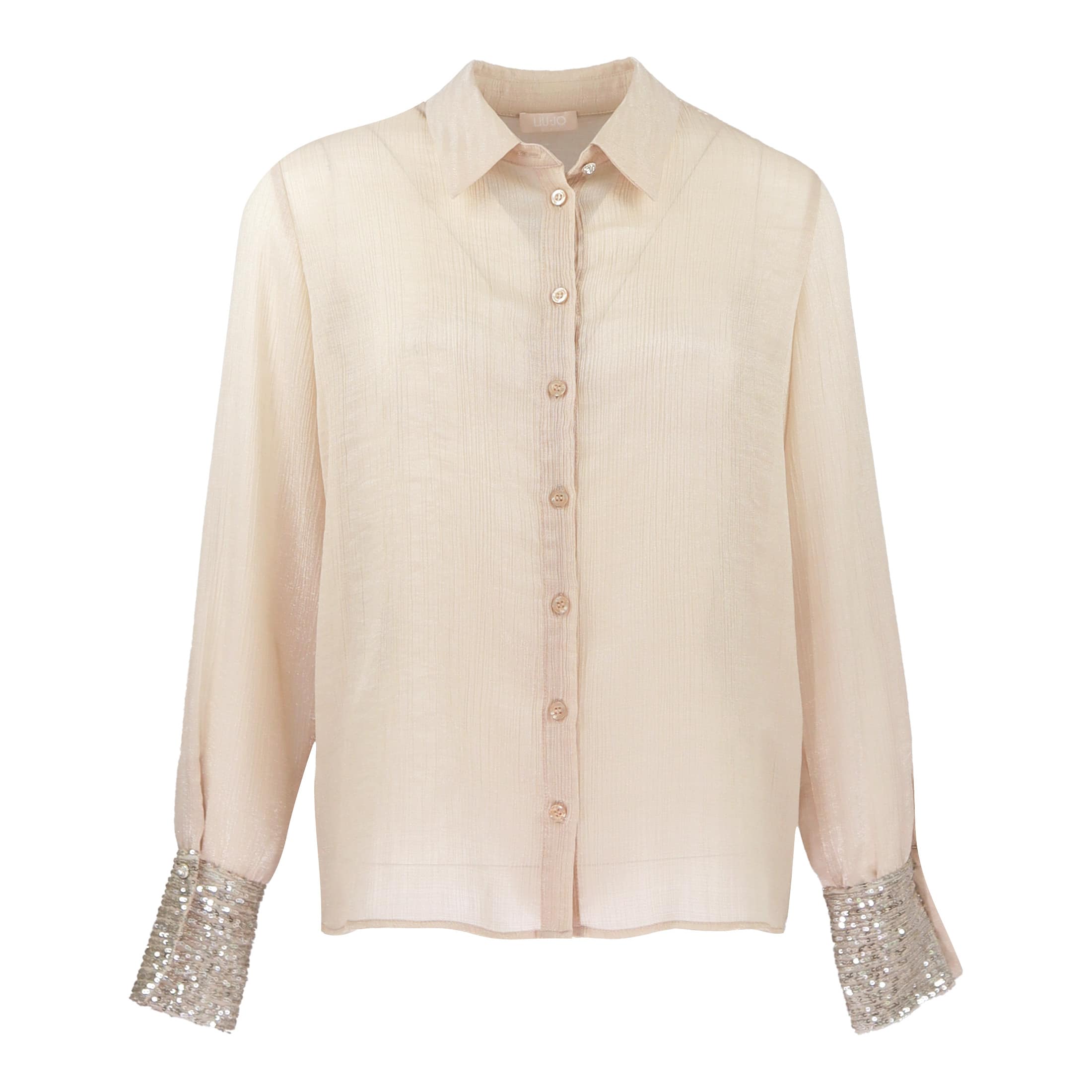 Blouse van Liu Jo, model tunica ts nav in nudo shine. Deze blouse is gemaakt van een licht glanzende relief stof, sluit aan de voorzijde met een knoopsluiting en heeft een klassieke kraag. De blouse heeft een losse pasvorm met lange mouwen waarbij de manchettenen bezet zijn met zilveren pailletten.