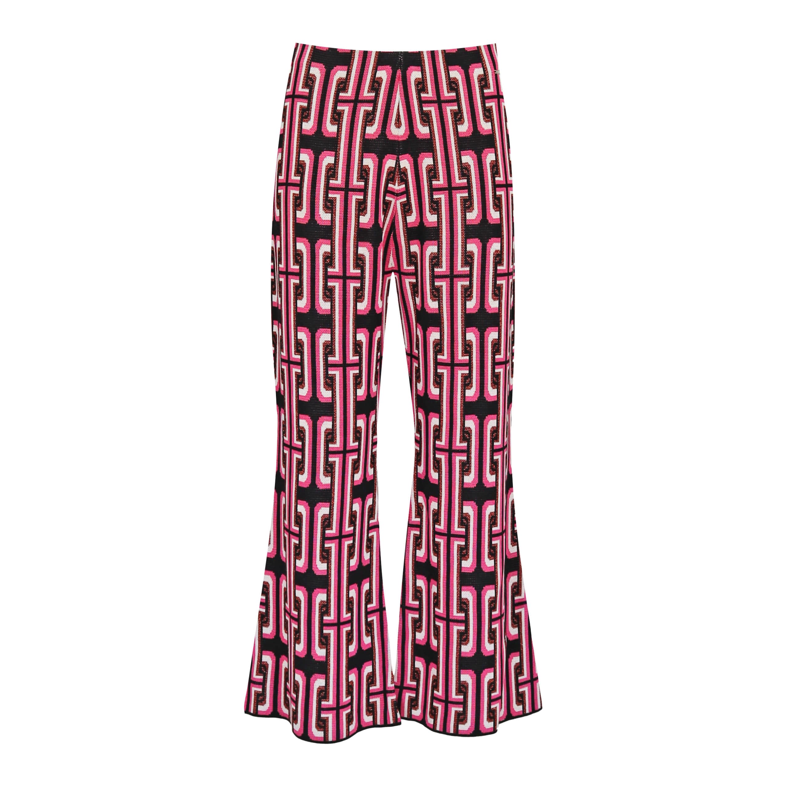 Flared pantalon van Liu Jo, model pantalone maglia jac in black geometric. Deze broek is gemaakt van een soepelvallende jacquard stof met een zwart met roze motief. Hier doorheen is een metalic draad verweven. De pantalon heeft een hoge elastische taille met uitlopende flared broekspijpen.